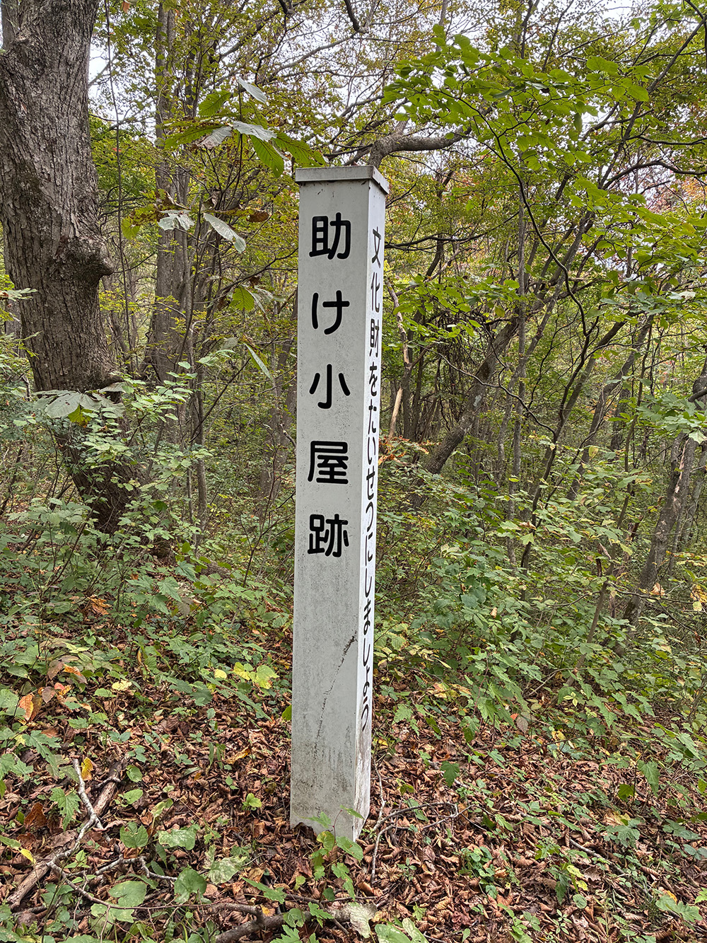 このあたりの小広い平地に「助け小屋」があったため、標柱が立っています。