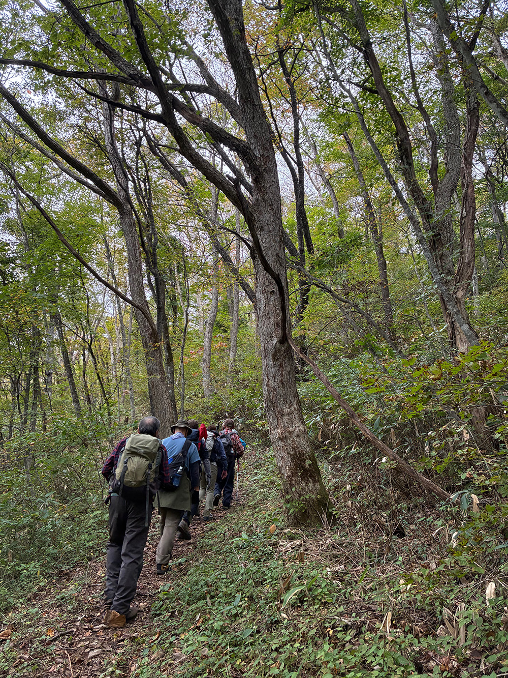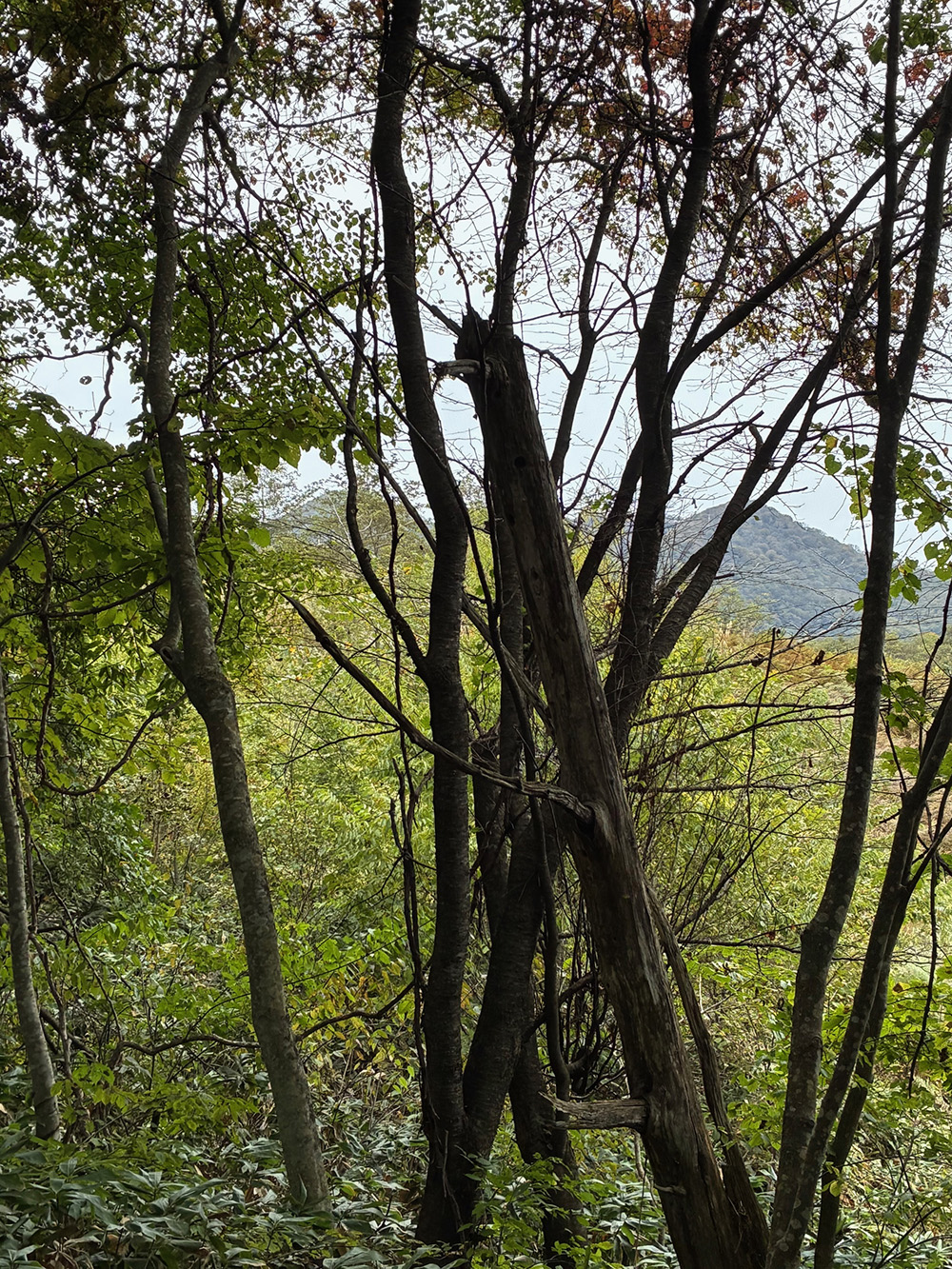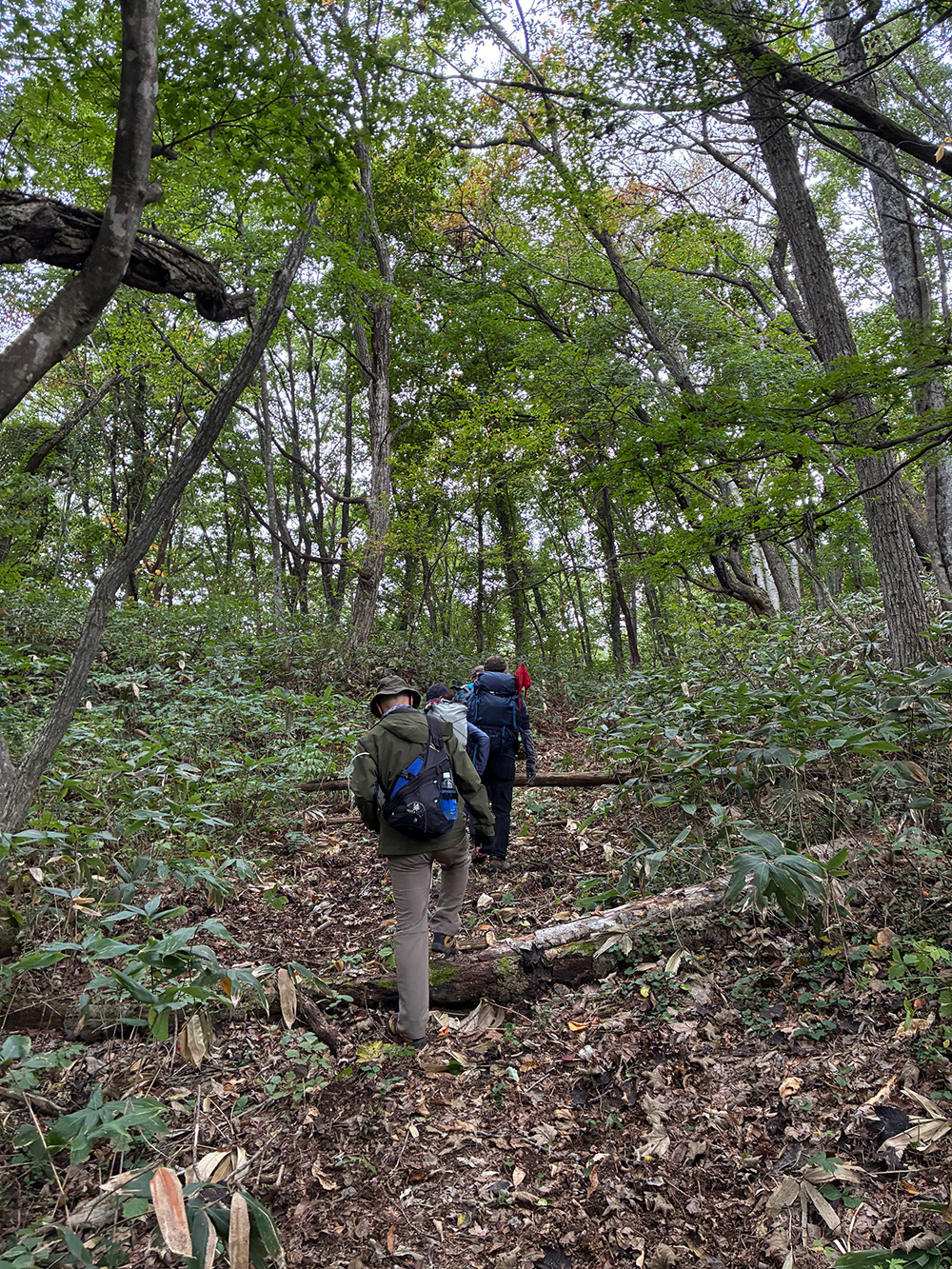 道の左右にマンダやダケカンバが見られる落葉広葉樹の林を進みます。