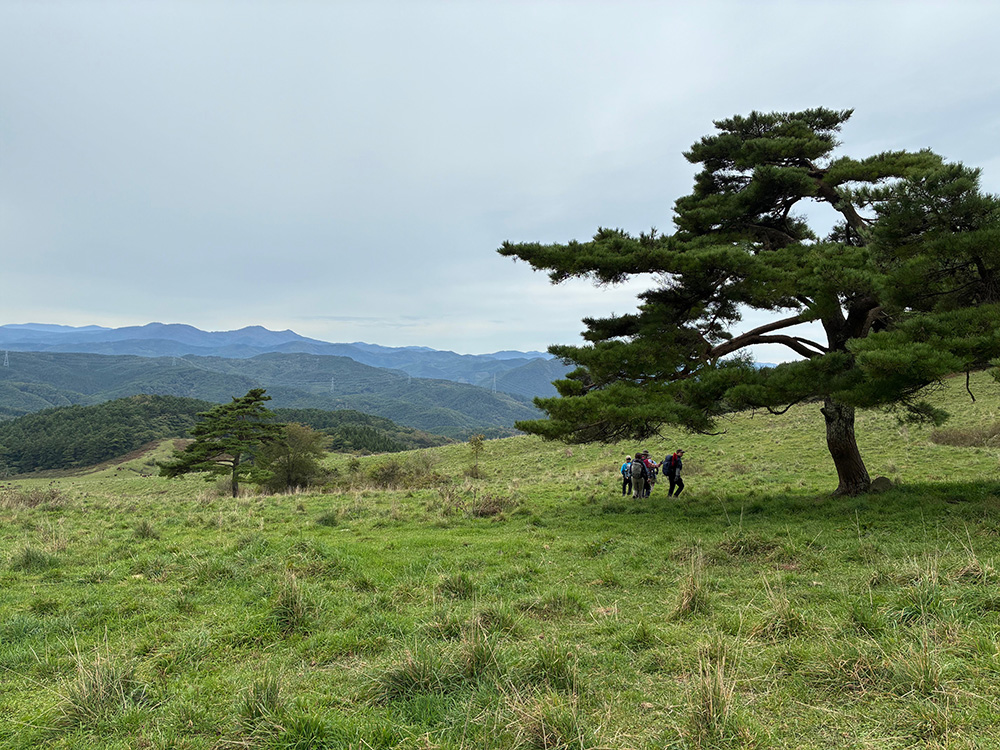 さらに5分ほど進むと坂はなだらかになり、左手の木々の間に緑の平原がのぞけます。