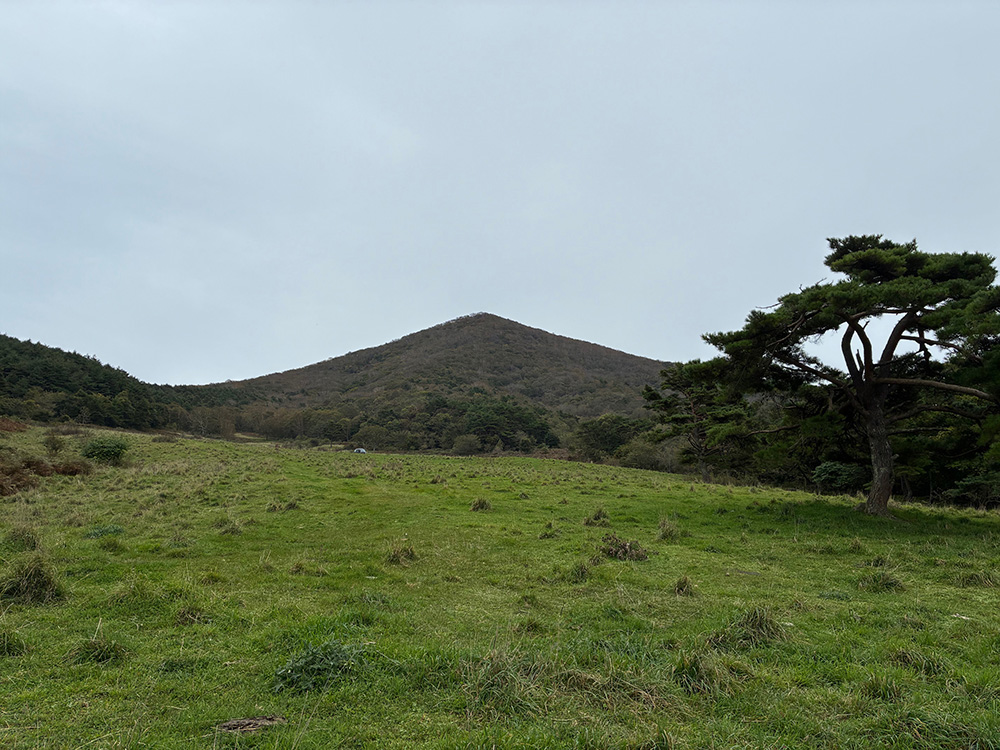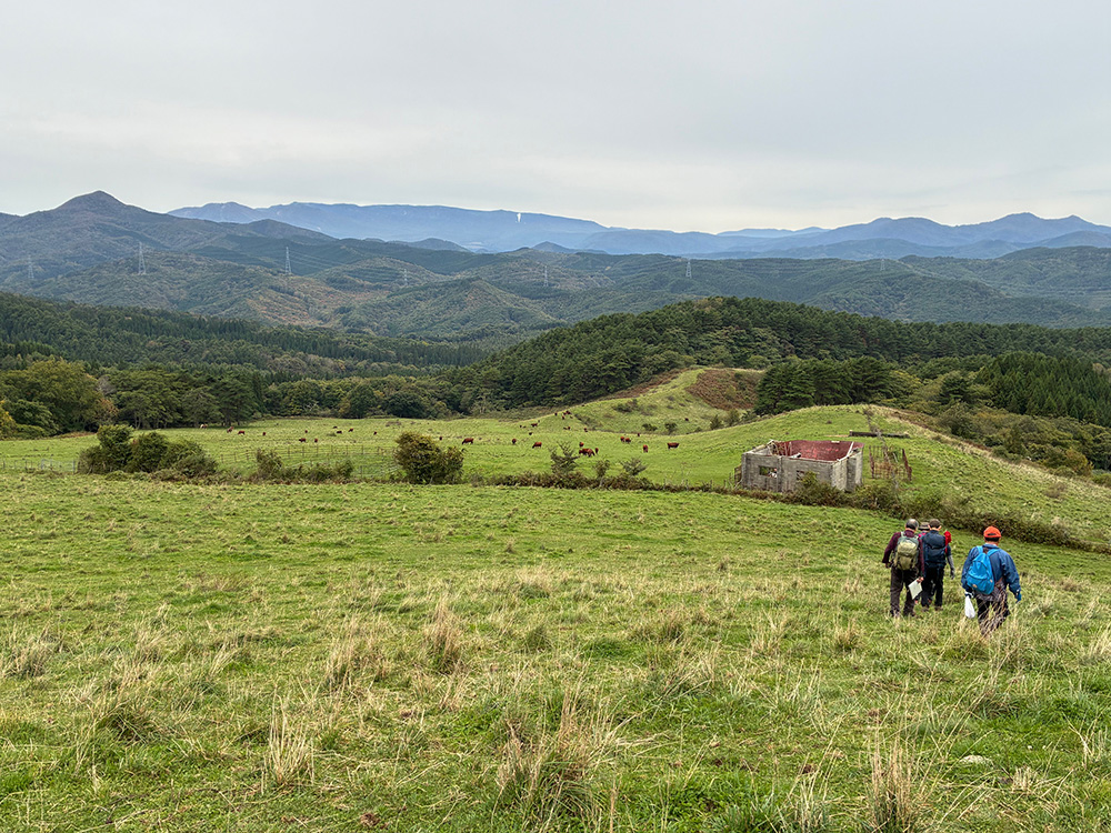 そこからさらに林の中の平坦な道を約30分進むと牧野に出て、視界が開けます。牛の糞に気を付けながら下っていく途中に振り返ると七時雨山が裾野を大きく広げています。