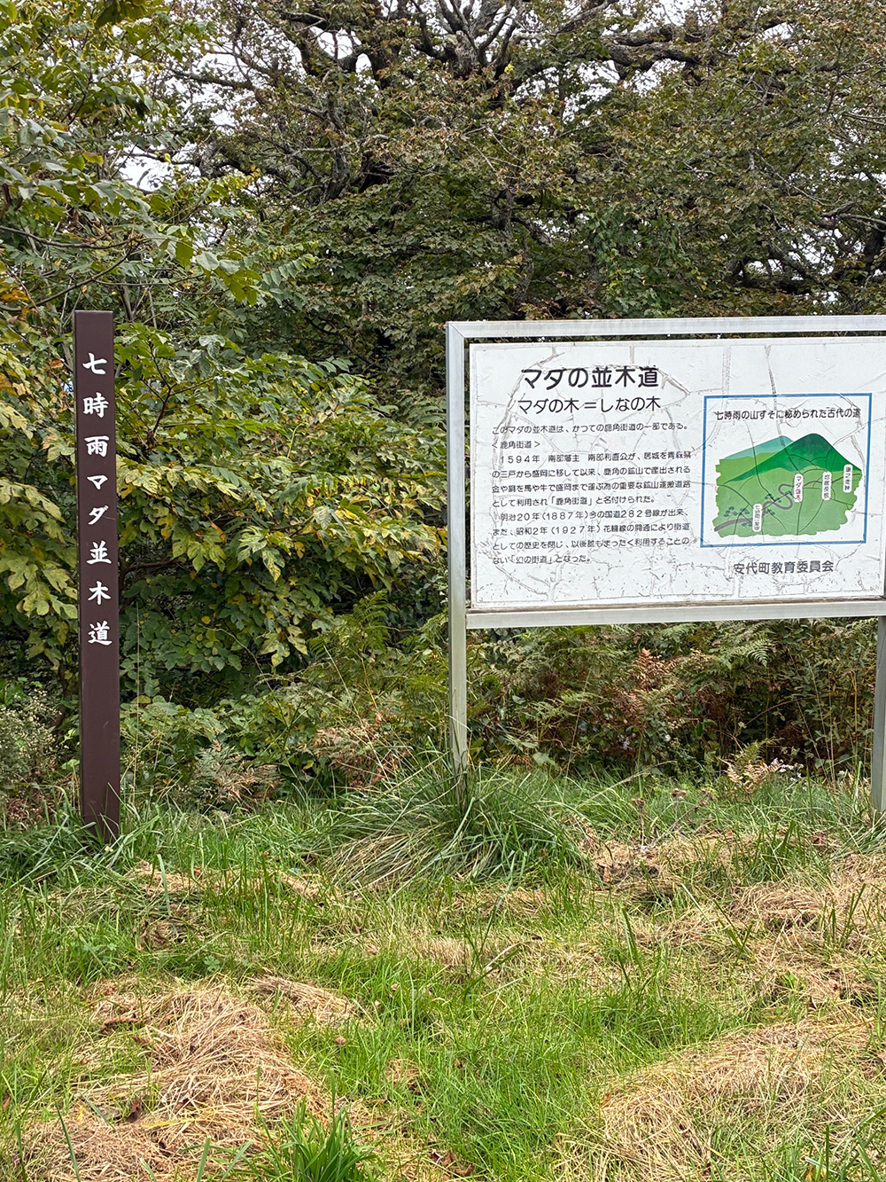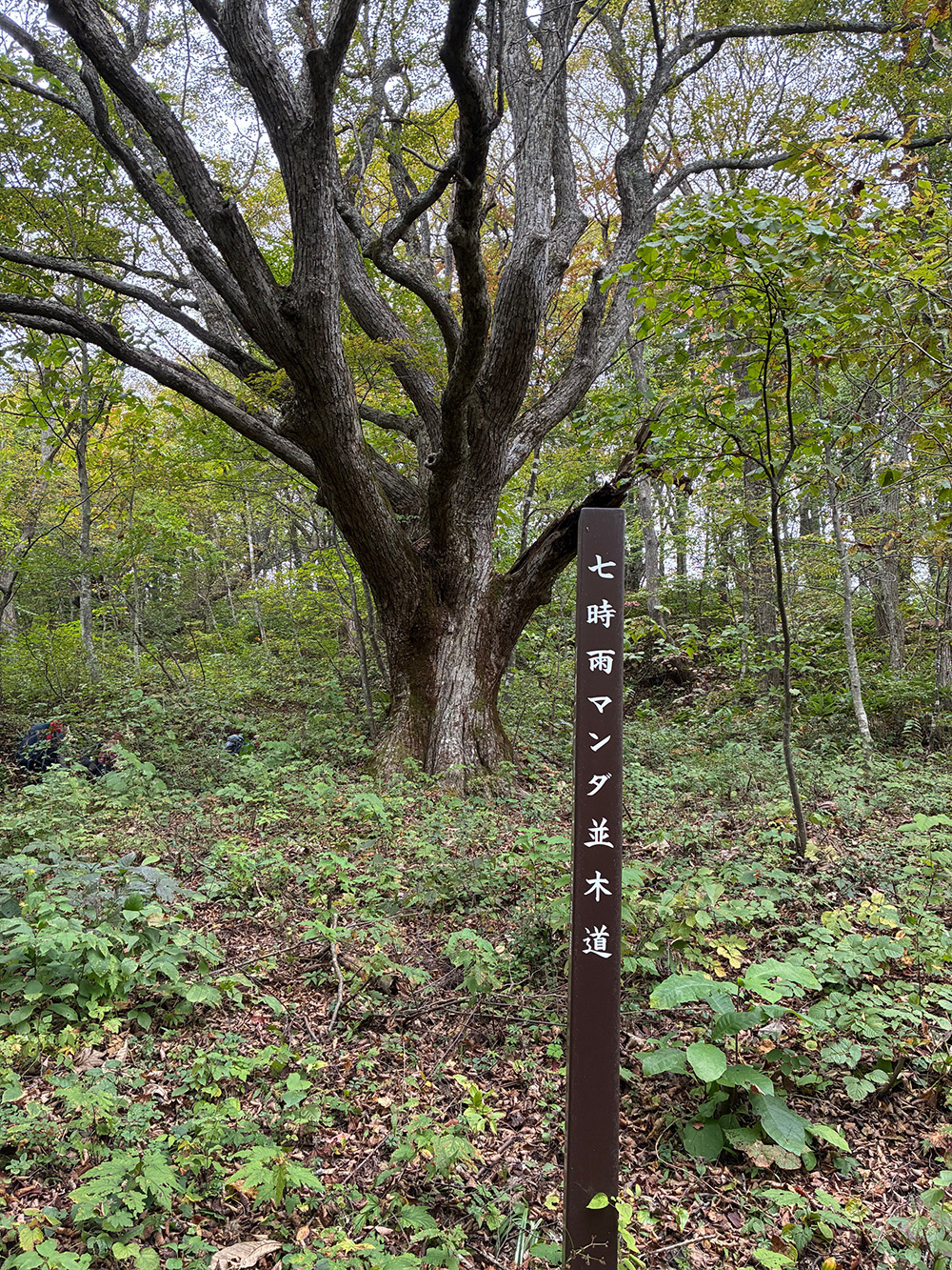再び登り坂となり、「七時雨マンダ並木道」の入口ではマンダ(ハンノキ)の巨木が出迎えてくれます。