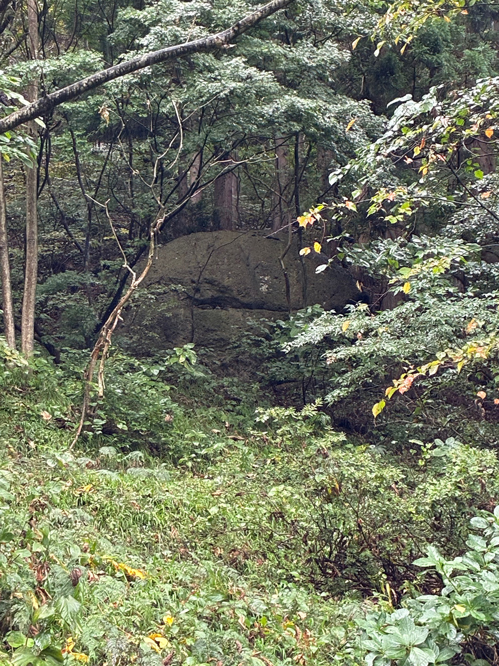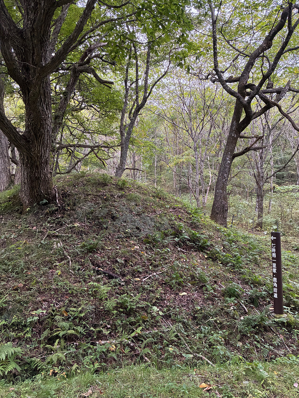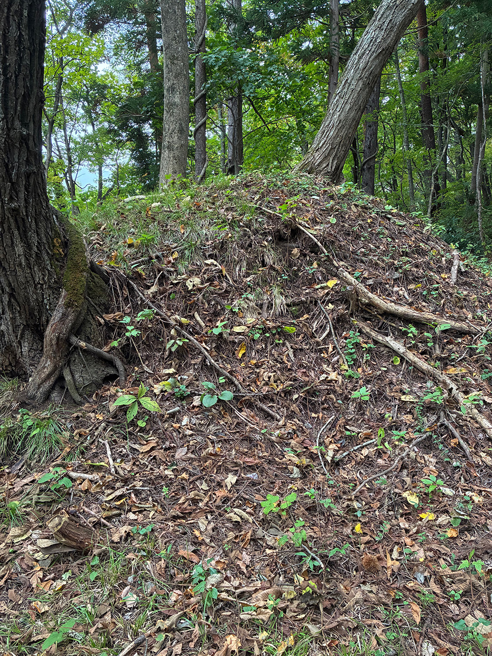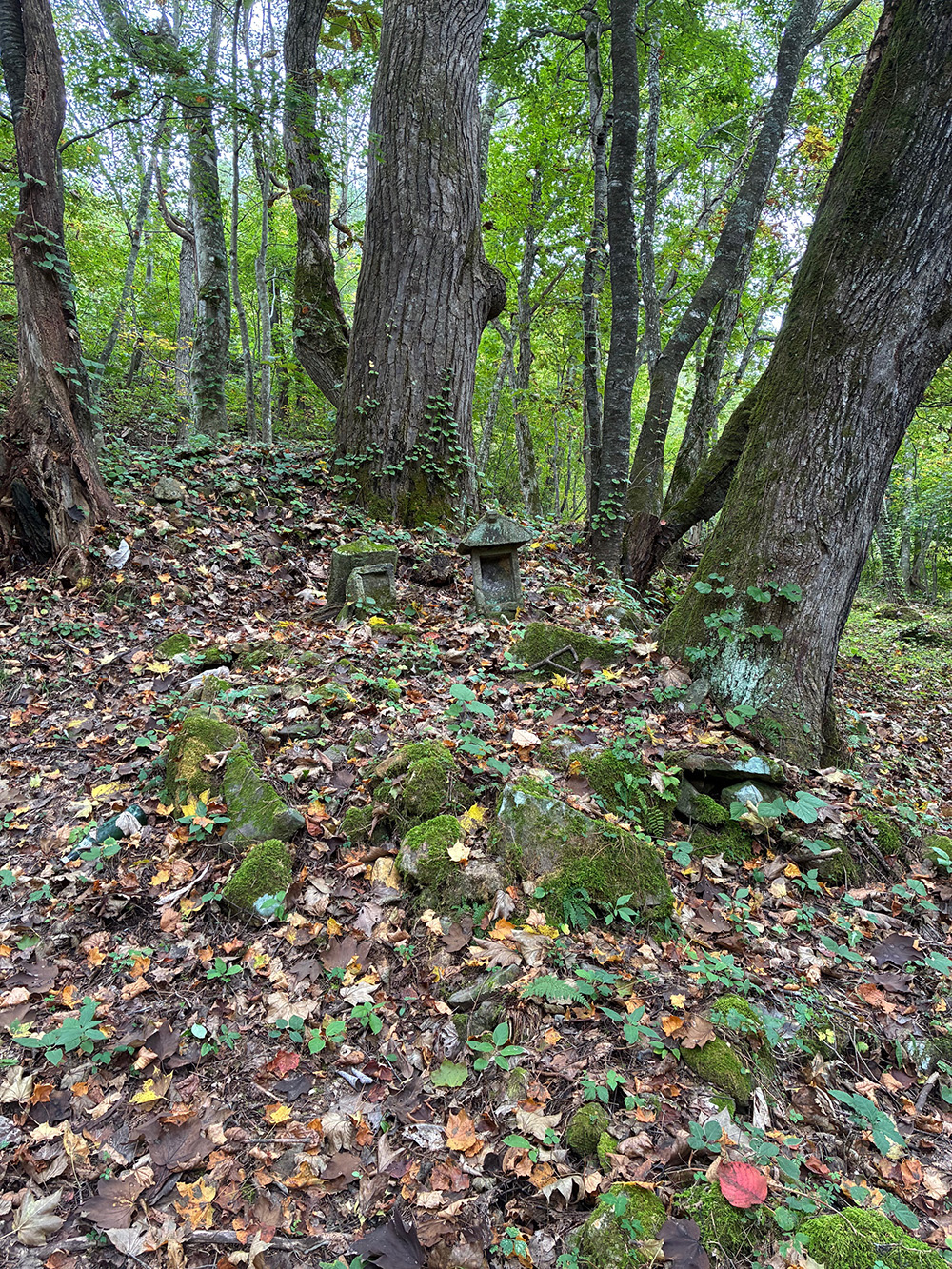 5分ほどで「賽の神跡」を通り過ぎますが、下草の生えた塚の下をよく見ると、石積みが残るのがわかります。