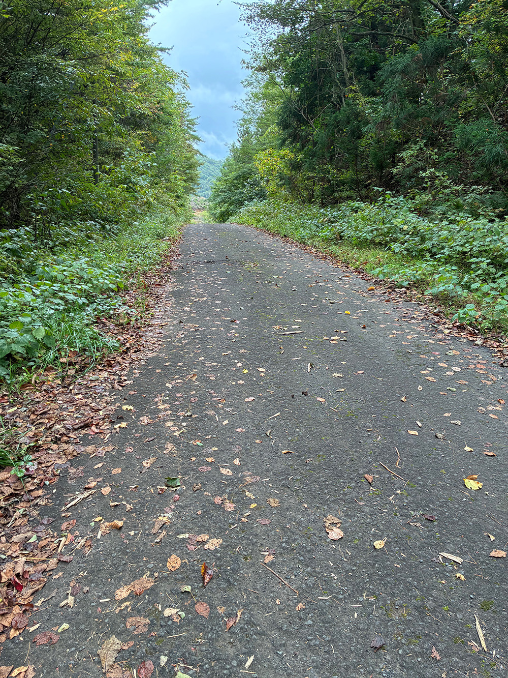 そのあとは平坦な道で左手に未舗装の細い林道が並走しています。