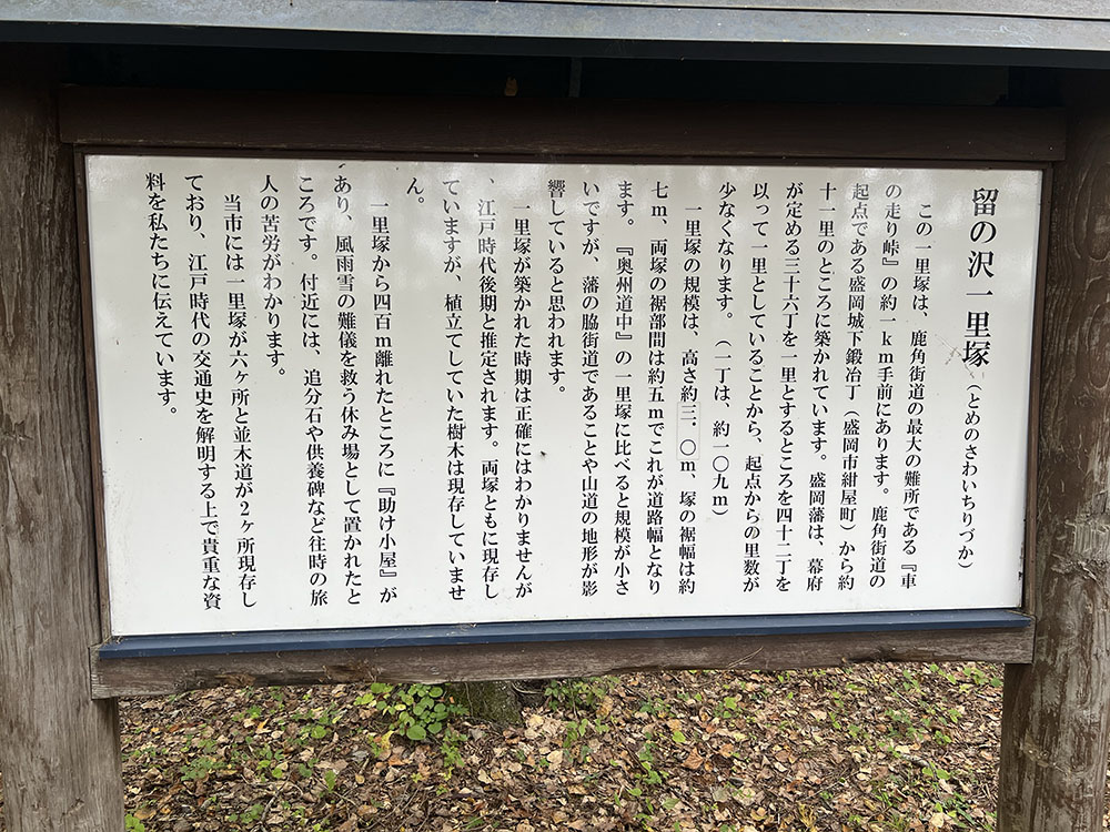 徳川幕府は、慶長9年(1604年)、街道と宿駅伝馬制度を整え、一里(約4km)ごとに道の両側に塚を築き、その上に榎などの木を植えさせた。南部藩も寛永年間(1624~1645年)に領内脇街道に一里塚を設置したが、幕府が一里を36町(3924m)としたのに対して脇街道は42町(4578m)。奥州街道の一里塚に比べて規模が小さく、塚の土盛りもやせたものが多い。