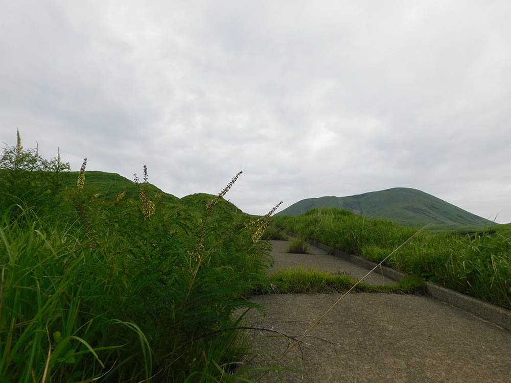 沿道にはカヤ、ハギ、ヨモギ、クララなどの自然の草木が茂り、左(東)に高岳・楢尾岳の岩稜、右(西)に往生岳、杵島岳のたおやかな山並みを見ながら登る。