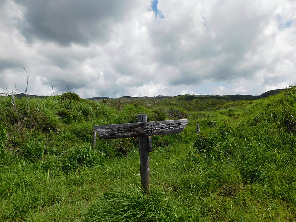 コンクリート道路から離れてここから左に入る。カヤの茂る草地をしばらく登るほどに、草丈は低くなり、馬の背と呼ばれる小さな尾根筋を行くようになる。