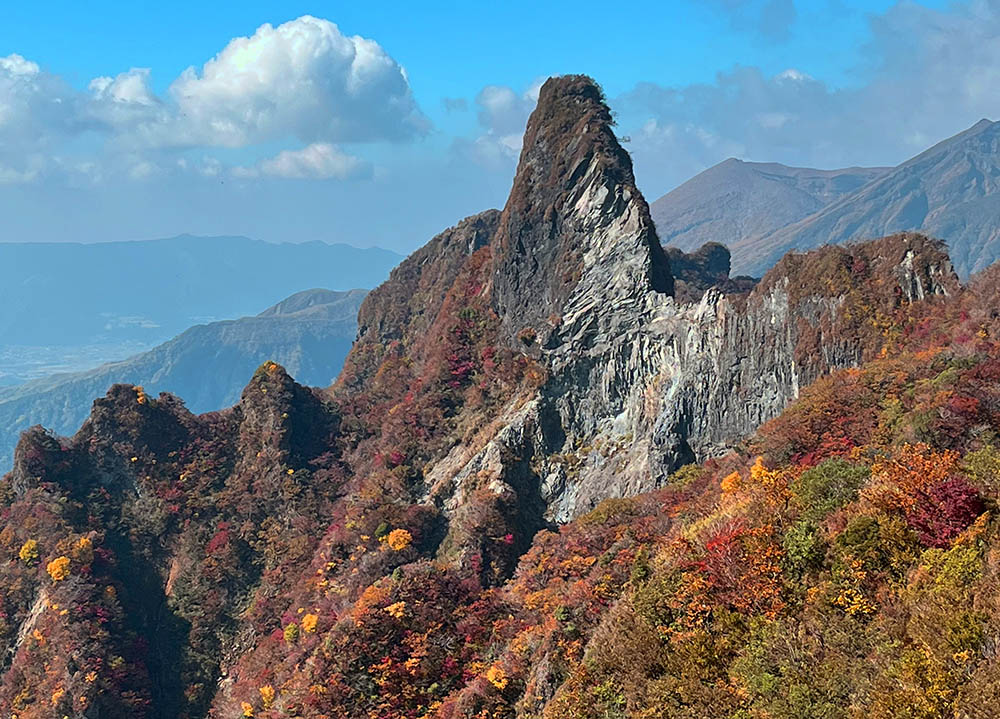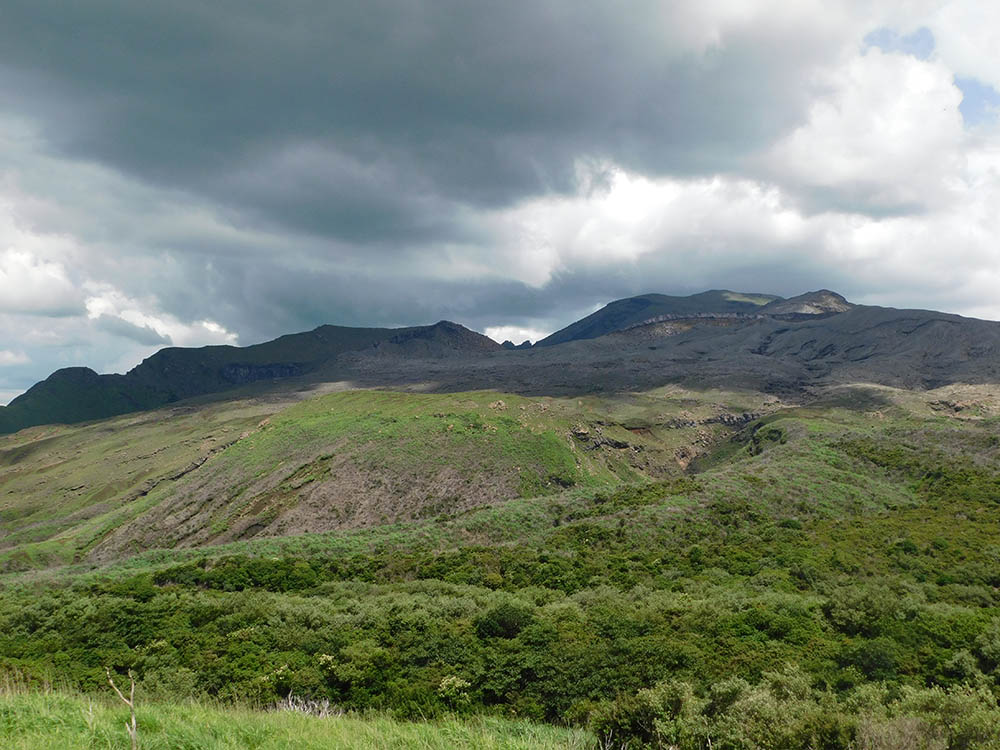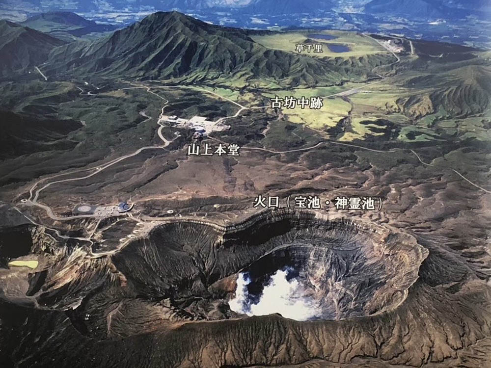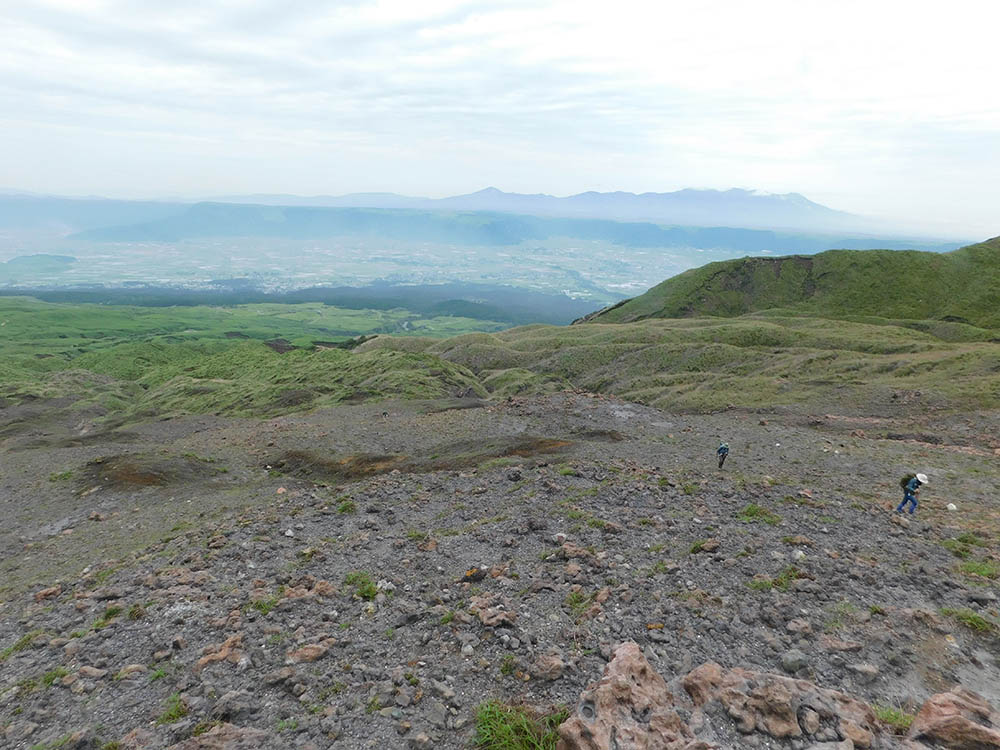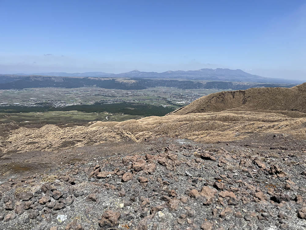 坊中への2時間の下りで、現在のピークが形成される前の古いクレーターの素晴らしいパノラマが明らかになる。外輪山の壁は高さが800フィートあって底はかなり水平であり、周囲30マイルの外輪山の中には100以上の村がある。したがって阿蘇山は、おそらく世界最大のクレーターといえる。