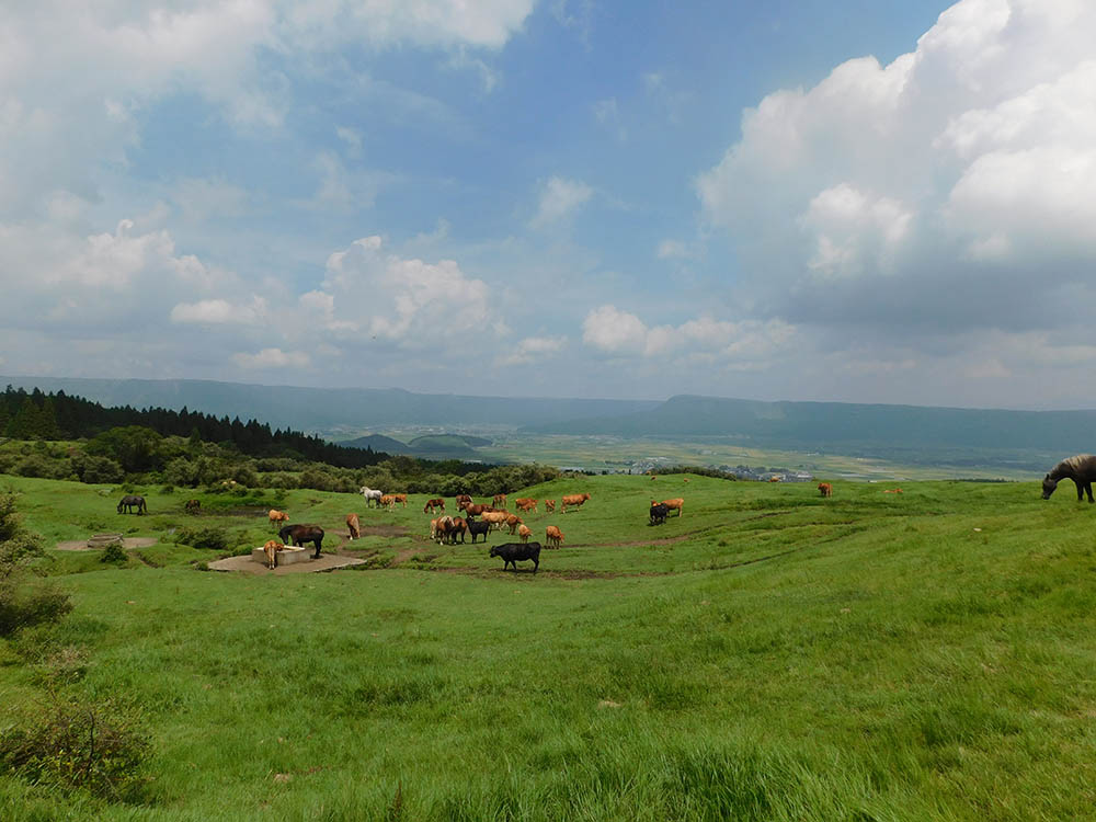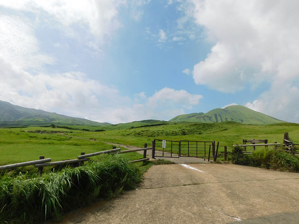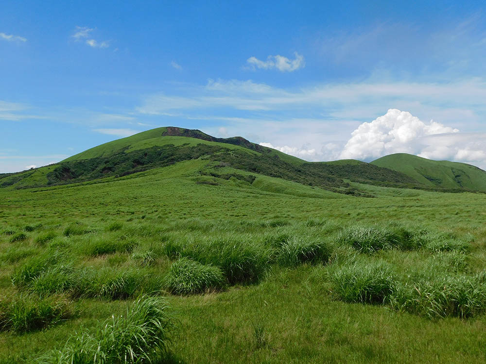 初夏にはカッコウやホトトギスの鳴き声も心地よく、振り返れば北外輪山やくじゅうの山並み、眼下には牛馬が草を食む牧野が一望できる。