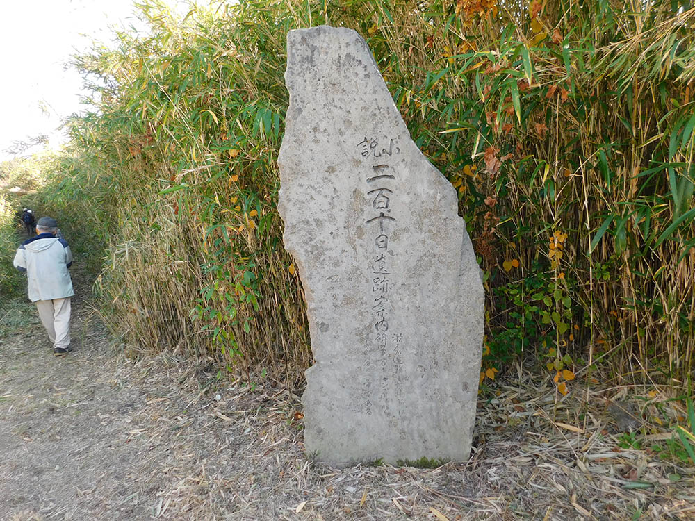 二百十日の9月1日、漱石は阿蘇神社に詣でた後、阿蘇山を目指す。当時阿蘇神社から中岳に登るには①一の宮からまっすぐ山の方へ向かって行く登山道があった。藤谷神社の前を通り馬の背登山道を経て中岳へ至る道である。この場合阿蘇神社裏手にある極楽寺を小説に出てくる出発点の寺とみる。しかし②漱石は阿蘇神社から(坊中)の方へ廻ったという説もある。同時代に国木田独歩が「忘れえぬ人々」の中に阿蘇山から下る場面を描いているが、独歩は坊中へ下り豊後街道を東へ辿った。漱石もこの道を通ったとみる。西巌殿寺は小説に出てくる描写が旧道と似ている。阿蘇町はここを小説の寺と設定している。西巌殿寺から上っていくと九州自然歩道入口があり、ここから登山道へ入る。漱石が①②どちらの道を選んだかはわからない。漱石らはススキの繁る道を中岳目指して進むが、天候が悪化し、雨・風・火山灰に難儀し谷に落ちてしまう。落ちたのは善五郎谷といわれている。実際のところはわからないが、阿蘇町はこの辺を漱石遭難の地とした。今は二百十日の文学碑が立ち、漱石の歌碑(数少い短歌)が立っている。「赤き烟黒き烟の二柱真直ぐに立つ秋の大空」。落ちた谷から脱出し、頂上をあきらめて下山した漱石らはどこに泊まったのか。小説では翌朝目がさめた所はうどん屋の3軒隣の馬車宿となっているが、俳句集には立野という所の馬車宿に泊まる、とある。漱石らは下山して立野へ出たことになる。馬車宿の名残の家は立野駅近くにあったが今は更地になっている。(城戸 邦晴)