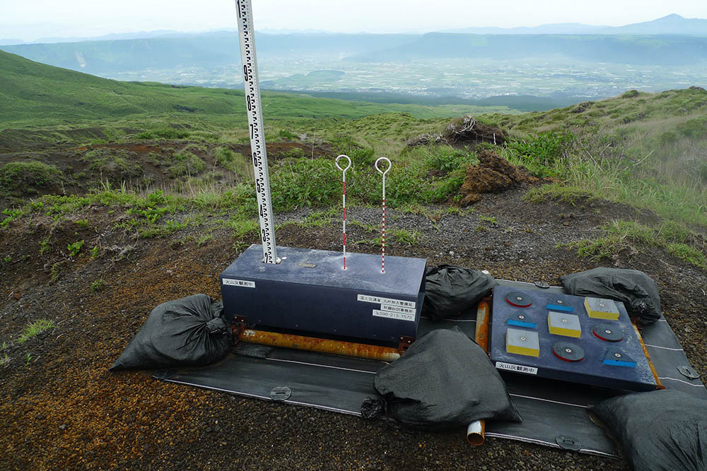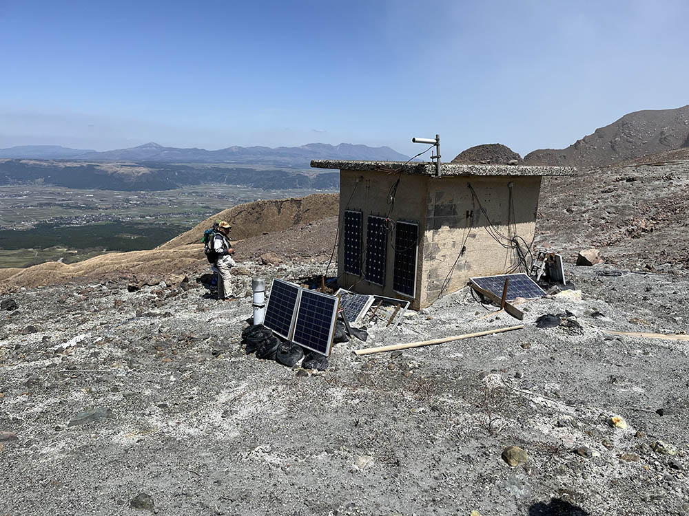 乏しい草と砂礫の間にソーラー発電器付きの地震計、その少し上には火山灰計測器が設置されている。