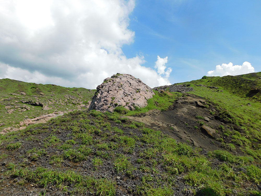 40分ほど登るとその尾根筋を塞ぐように直径5m超の大きな岩、火山弾が鎮座する。