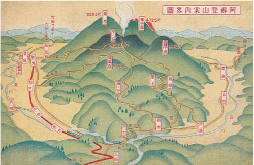 近世まで山岳仏教の信仰と修行の場であった阿蘇山は明治に入ると近代登山の対象となる。明治期には外国人による観光登山が持ち込まれ、J・ミルン、W・ウェストン、H・ポンティング、Mビッカーステスなどが訪れている。彼らはいずれも西側の栃木(とちのき)から中岳へ登り、火口を見学したあと北側の坊中へ下山するコースを利用している。おそらく「日本旅行案内」で紹介されている上記のコースが外国人の間で広く知られていたからだろう。H・ポンティングは著書のなかで、「日本旅行案内の手引きが大いに役だった」と述べており、「日本旅行案内」が当時の外国人旅行者に広く利用されていたことがわかる。