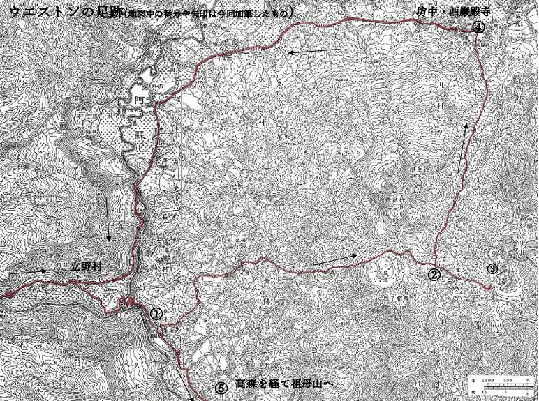 ウェストンの登山記の記述と所要時間から推理すると、1日目(2日)は熊本から人力車で立野に進んだあと、近くの滝や温泉を見学して栃木新湯に宿泊。翌3日は湯の谷温泉経由で中岳に登って火口を見学したあと坊中に下り、人力車で再び栃木新湯に戻って泊ったと思われる。なお祖母山に同行したブランドラムは、阿蘇登山の経路から考えて途中から同行したとは考えにくく、熊本出発時から一緒だったのではなかろうか。