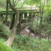 ここから150mほど沢沿いに北上すると、明治期の旧新沢橋梁の橋桁が残っているので見に行こう。開通した当時はこちらが正道であったが、橋が崩落したため新アーチ橋ができた。