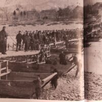 古老によると、「昔(江戸時代のころ)は、川の浅瀬を歩いて渡っていたようだ」と話しますが、明治11年6月に会津街道を旅したイギリス人旅行探検家イザベラ・バードの「日本奥地紀行」によれば、「私たちは大きな川の橋を渡ったが、こんなひどい道路にこんな立派な橋があるとは驚くべきことだ。これは12隻の大きな平底船からなる橋で、どの船も編んだ藤蔓の丈夫な綱に結んである。だからどんなに水かさが多くなっても平底船と板の橋は自由に上下できるようになっている。」と書き記しています。