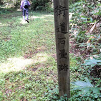 車峠入口からは緩い登り道が1時間ほど続き、旧国道49号線と合流して進んだ先で、標高267.1mの標準点を過ぎると茶屋跡です。
