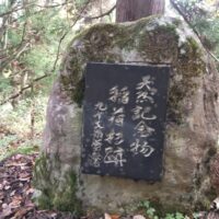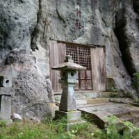 地元の口伝えに「八幡太郎義家が冑を脱いで休んだところ」と言われ、垂直の壁をくり抜いた神社が残されている。