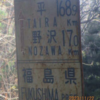 表示は、「平168.9km 野沢17.0km 福島県」と三段に記されています。福島県設置の道路標識看板です。