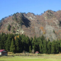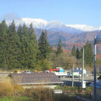 この高台の集落から北側方角を振り向くと、好天のなかで真っ白くなった大日岳と飯豊山が見えていました。