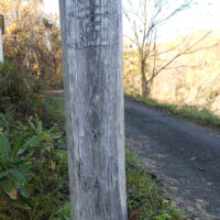 上の堤へ向かう坂道の登り口に「飯豊山」反対側に「鳥井○」と彫られた二本の木製の標柱がありました。