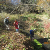 R49号に突き当たって横切ると、古道に入る土手から小川まで30m位が藪刈されていました。
