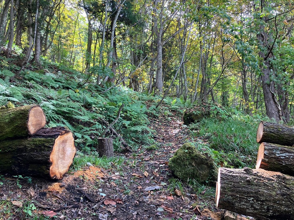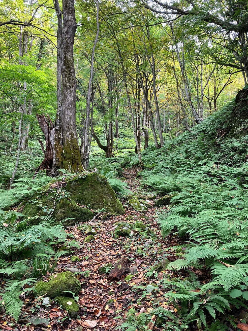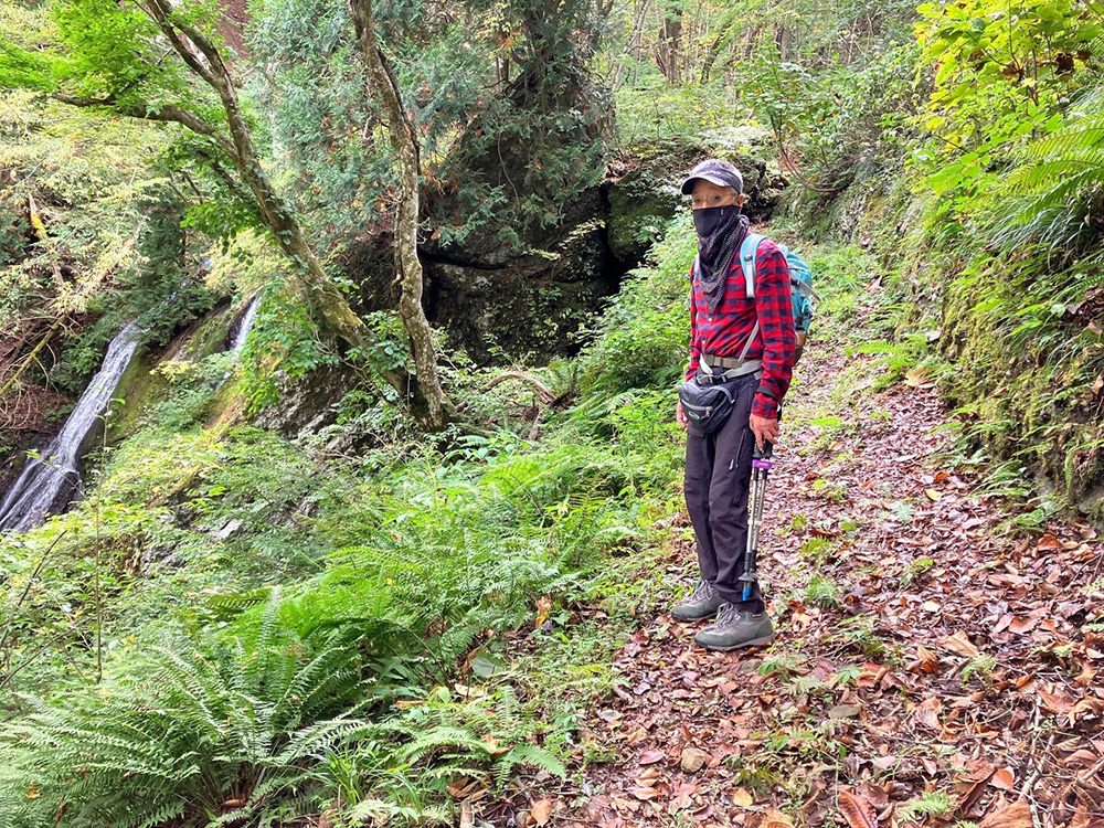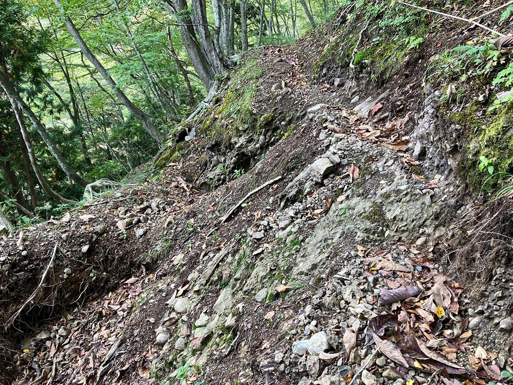 最後のカーブから古道の面影を残した世界に変わります。秋には落ち葉の積もる道を少し進むと左手に無名の滝が見えて来ます。その後も趣のある古道を進みます。その先に大きな倒木がありますが、ここは手が入れられています。