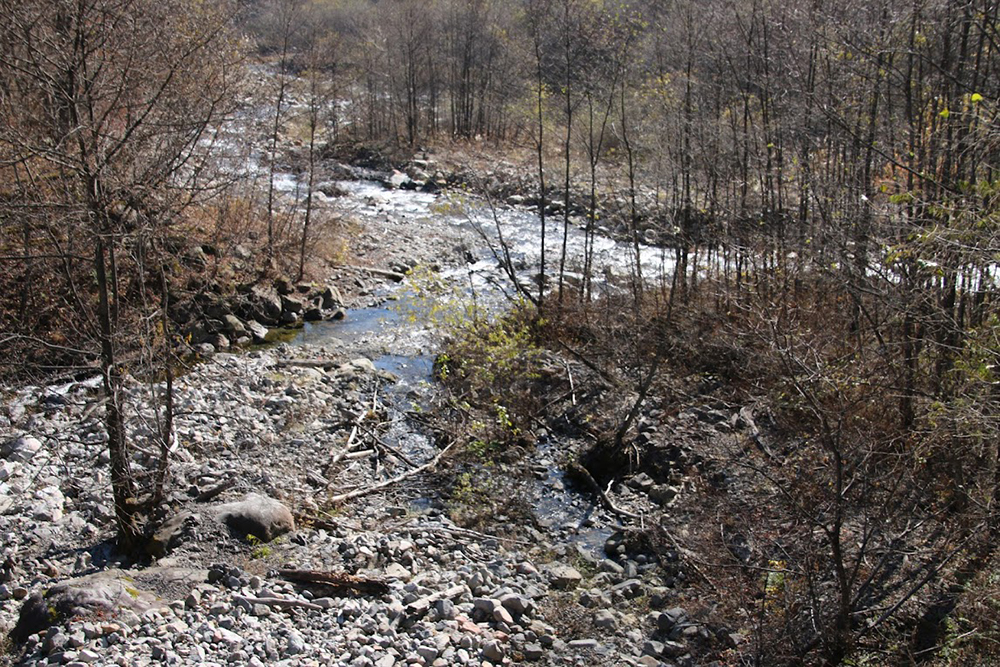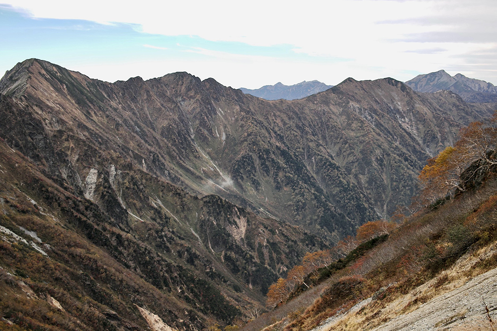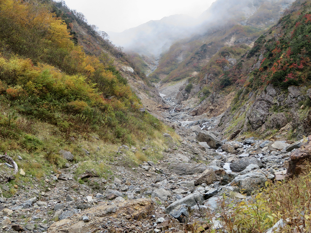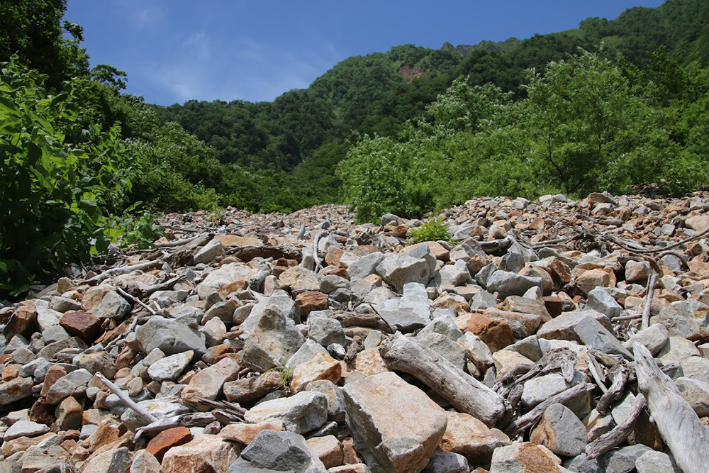 両岸の山肌には崩壊の跡があり、沢は荒れた箇所もあります。