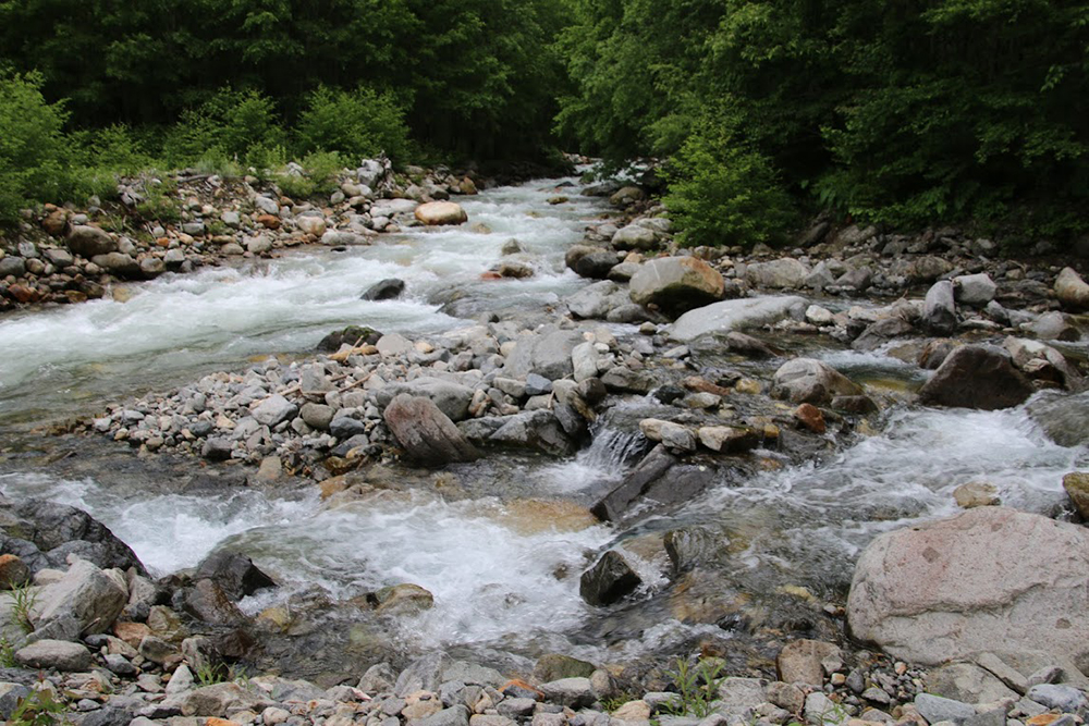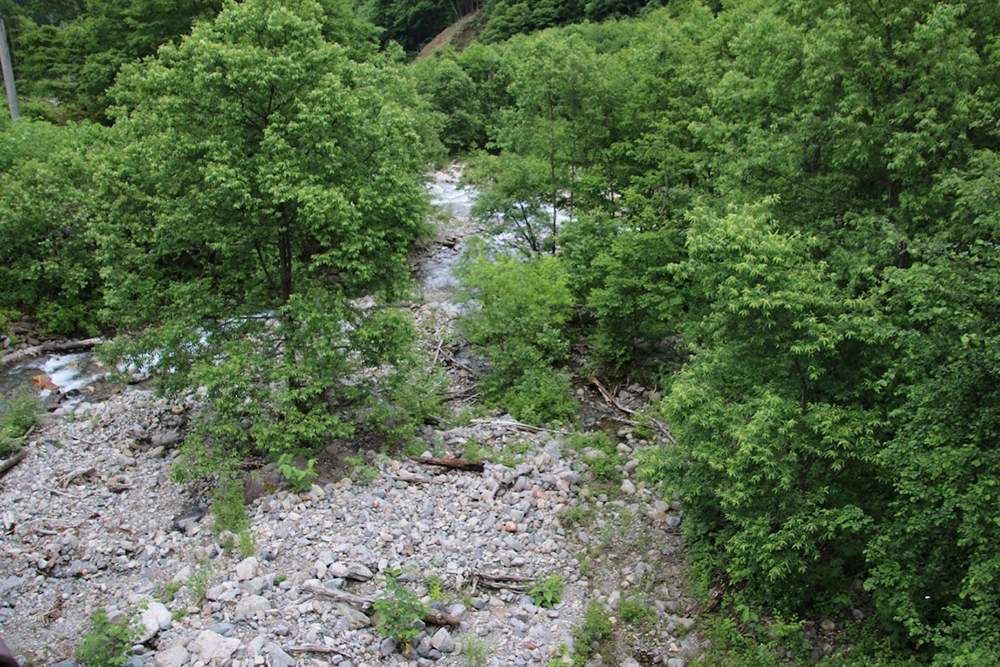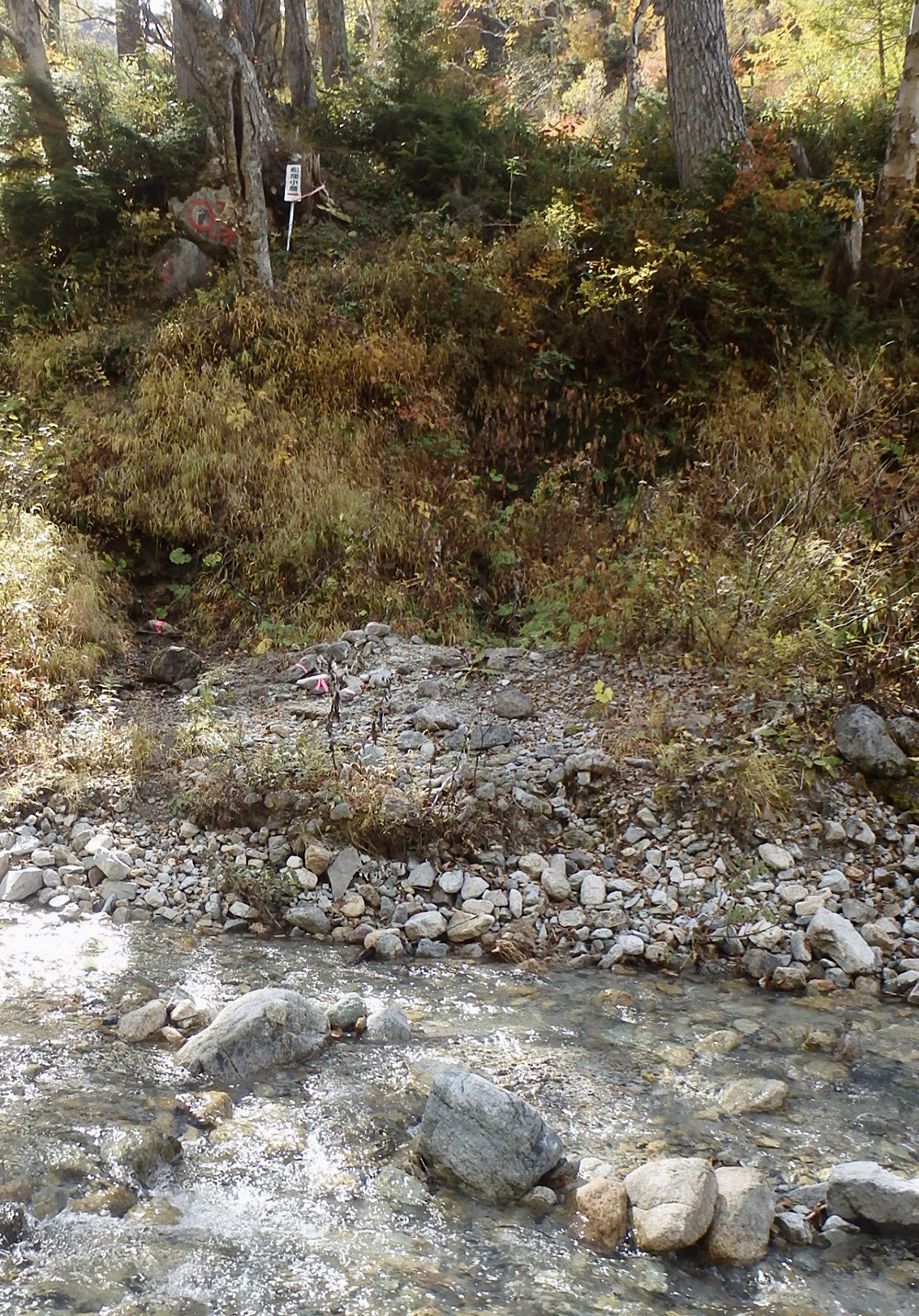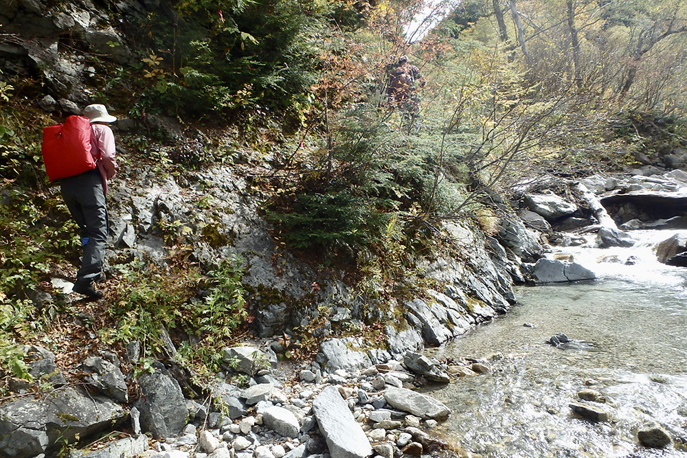 ガレ場を何回か横切り、河原に降り立ったら間もなく左岸に渉ります。