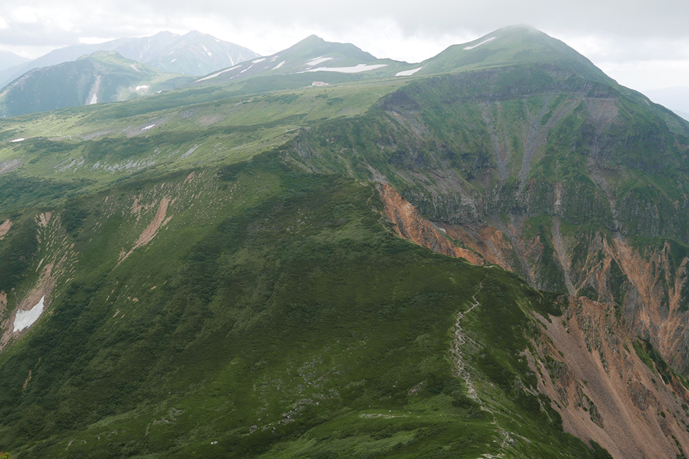 赤茶けて草木のない荒涼としたカルデラに対し、中ノ谷は緑に覆われ、遅くまで雪渓が残ります。