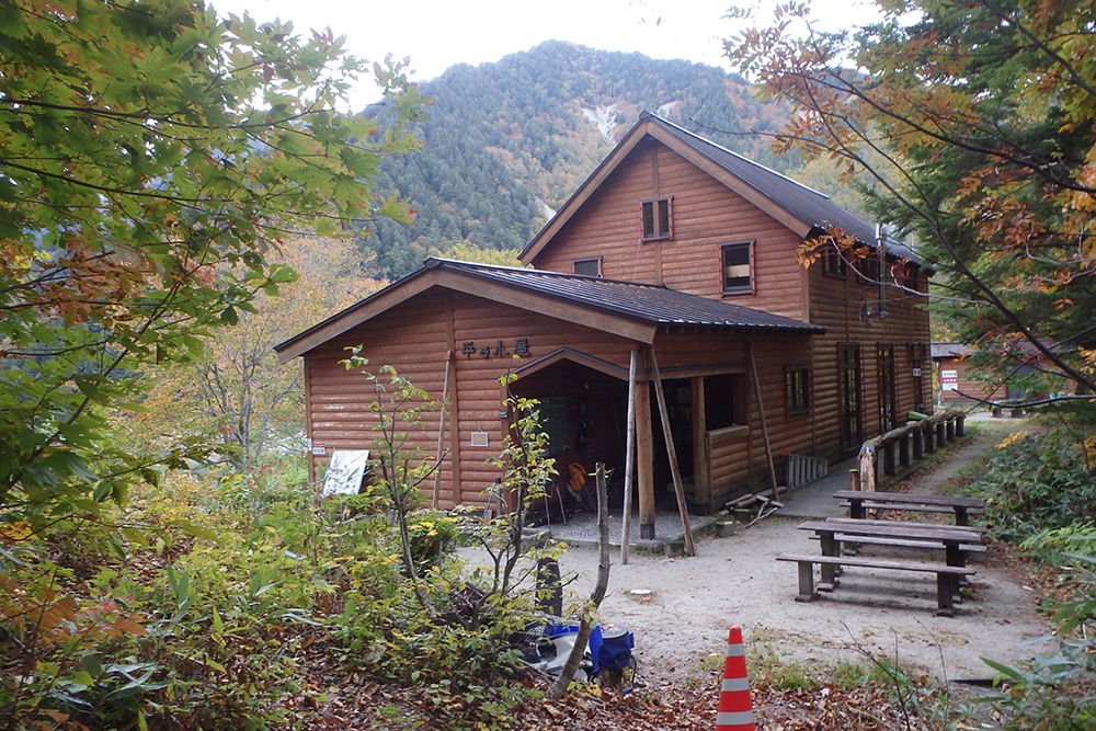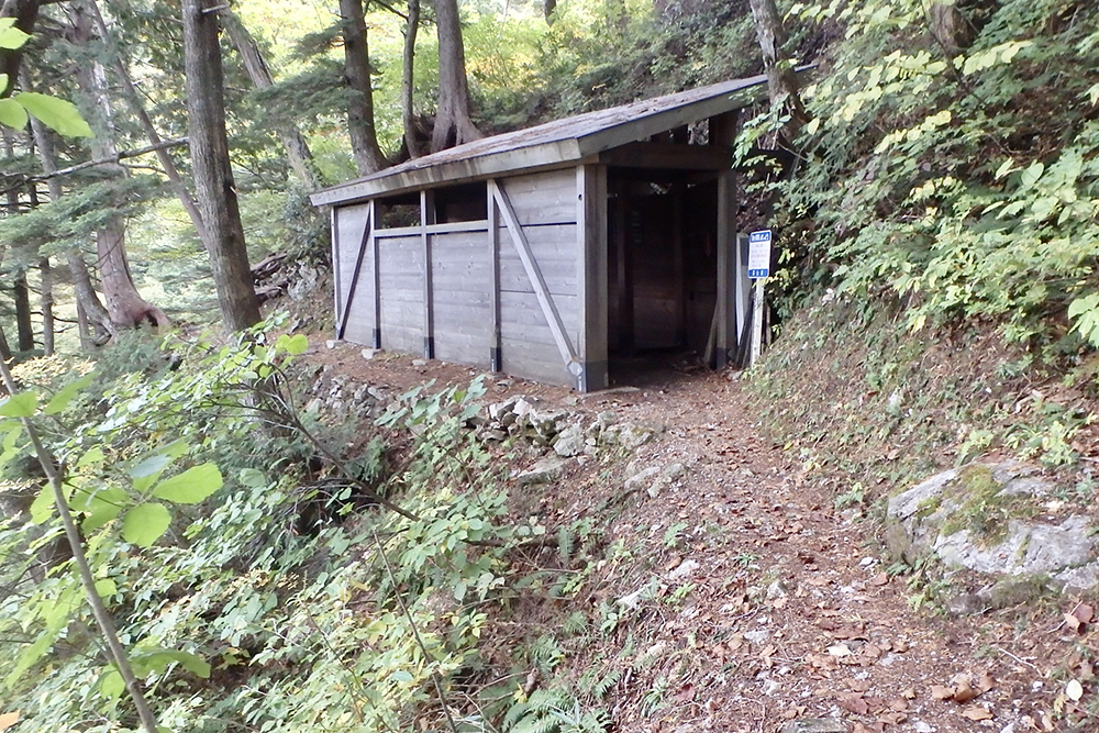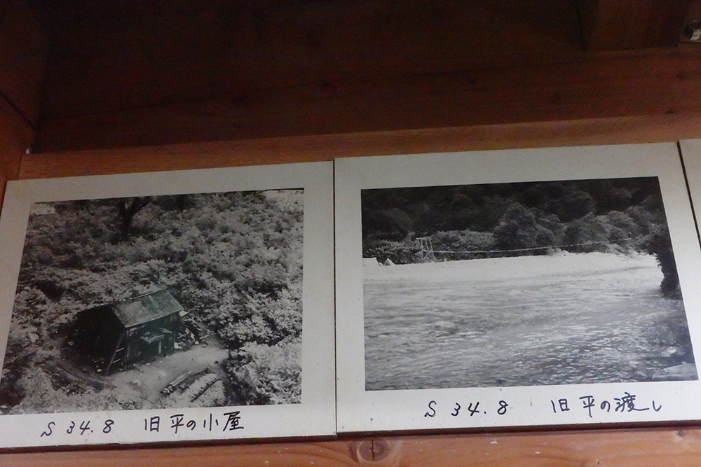 木の間にヌクイ谷の流れが見えてきたら、長い下りも終わりに近く、しばらく水平の道を歩いて平乃小屋(地形図には「平ノ小屋」)に着きます。小屋の食堂には、ダム湖に水没する前の小屋や吊り橋の写真が掲げてあり、往時を偲ぶことができます。