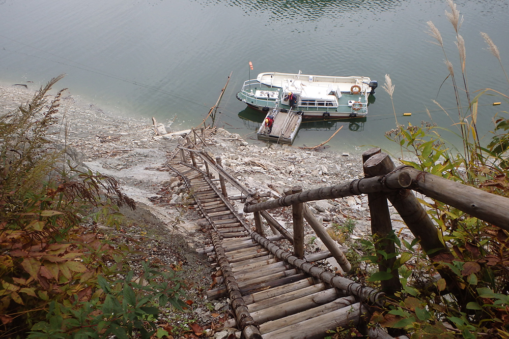 平乃小屋から乗船場までは、水平な道を黒部ダム方向に少し歩いて急なコンクリート階段とそれに続く丸太階段を降ります。ライフジャケットを着け乗船名簿に記入したら出航、対岸まで10分足らずの乗船です。