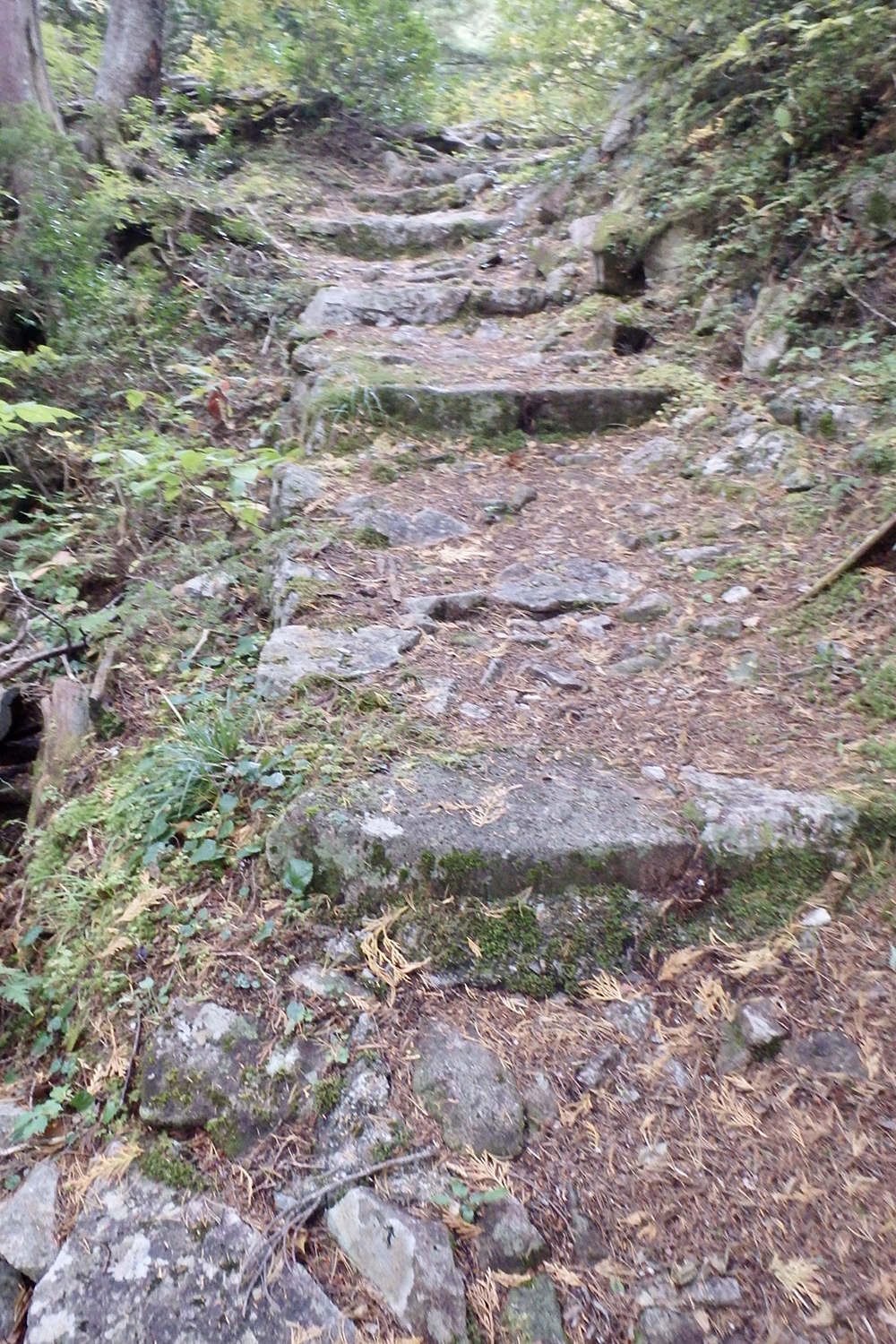 大町駅から車道で14km、野口神明社から12kmあり、古道は篭川べりの密林の中となっていて歩くのは困難です。