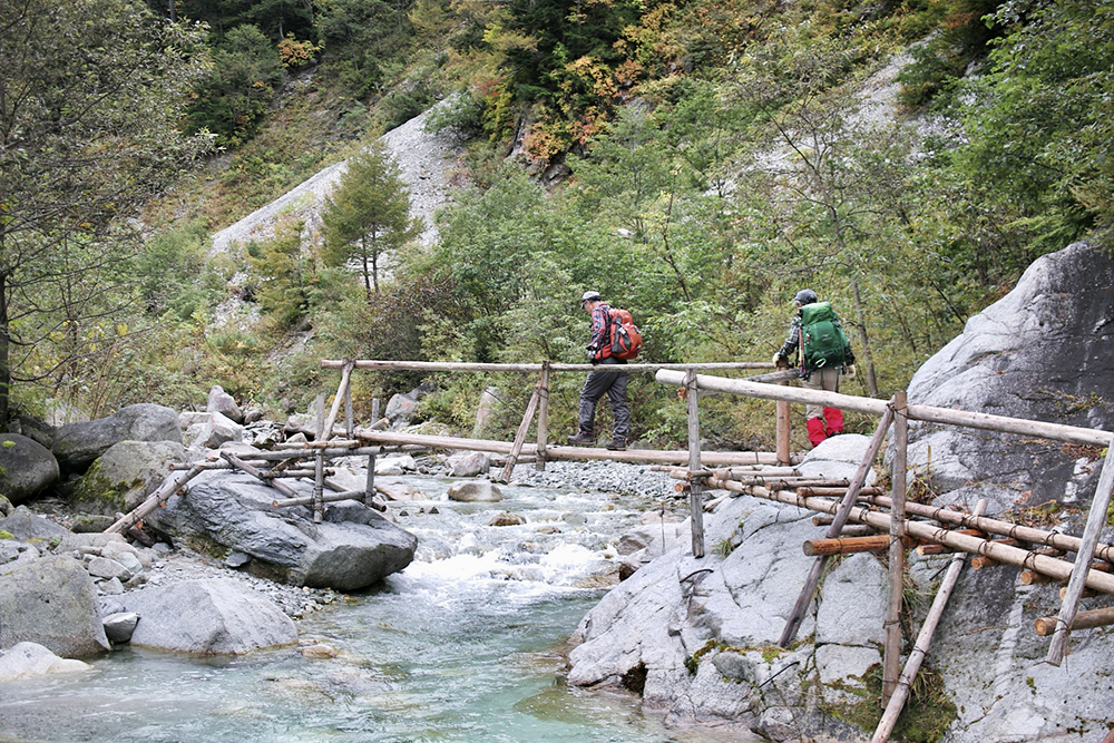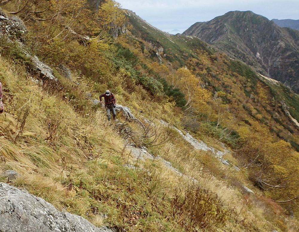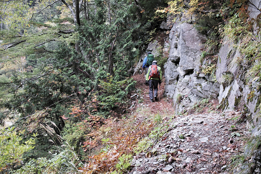 針ノ木谷の流れを見下ろしながら行くと、石の階段や崖をへつった箇所があります。