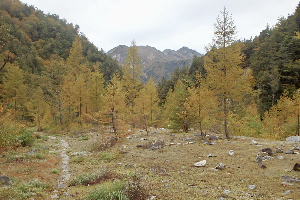 間もなく谷は開け、平坦な砂地に踏み跡があり、ふり返ればカラマツの疎林の向こうに立山が見えています。