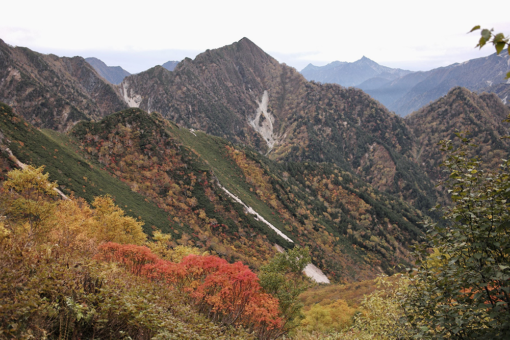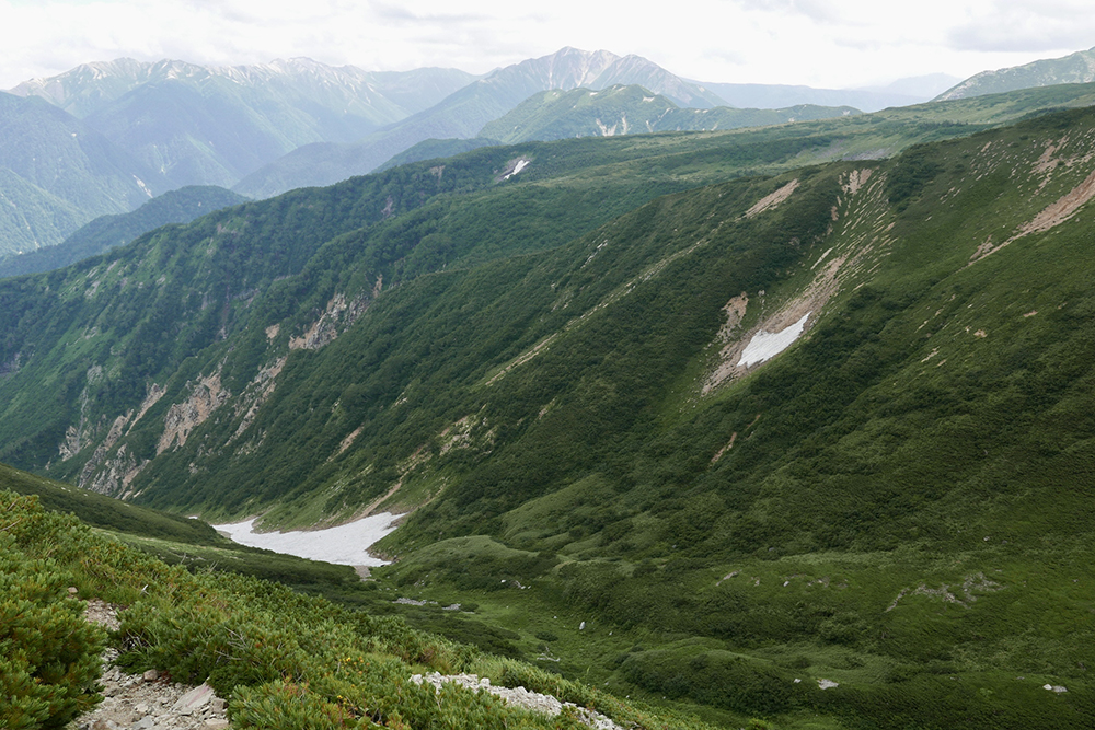 獅子岳の下りで行手に目をやれば、五色ヶ原手前の鞍部がザラ峠で、その右側が立山カルデラ、左側がかつては古道があった中ノ谷です。