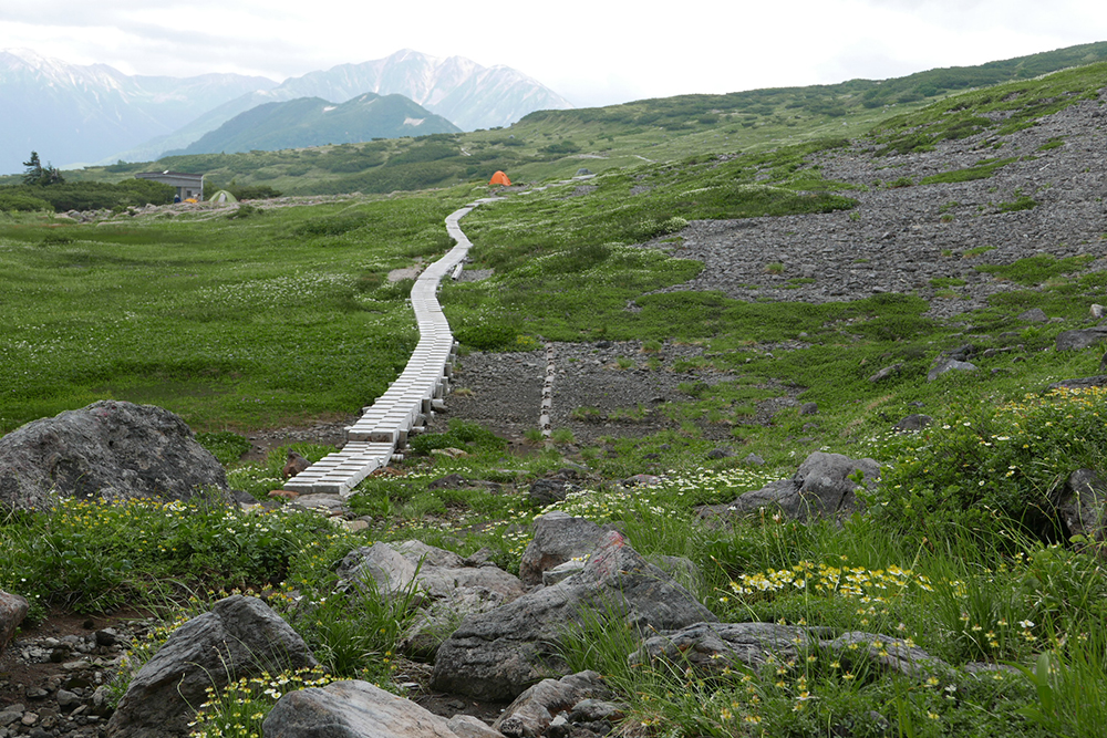 薬師岳方面への縦走路と別れてしばらく行くとキャンプ場の横を通り、前方に赤牛岳など黒部源流の山々を見ながら五色ヶ原を緩やかに下っていきます。木道の両側はお花畑です。