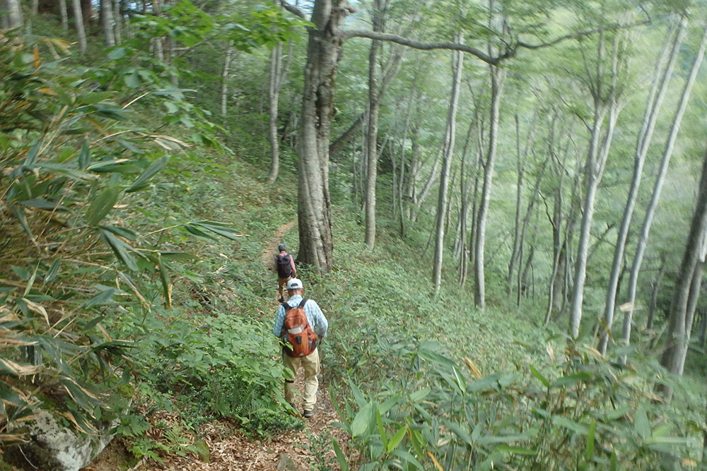 刈安峠からは尾根筋を離れてヌクイ谷側の斜面を標高差で約500mほど下ります。刈安峠から平までは、古道とほぼ同じルートを辿ります。1916年(大正4年)にここを歩いた木暮理太郎の紀行文に「ブナ坂」とあるように、今もブナの美林の中の道です。