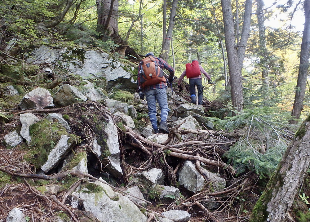 やがて涸れ沢となり、笹や灌木が頭上に被さって歩きにくい道ですが、ブッシュ漕ぎはありません。