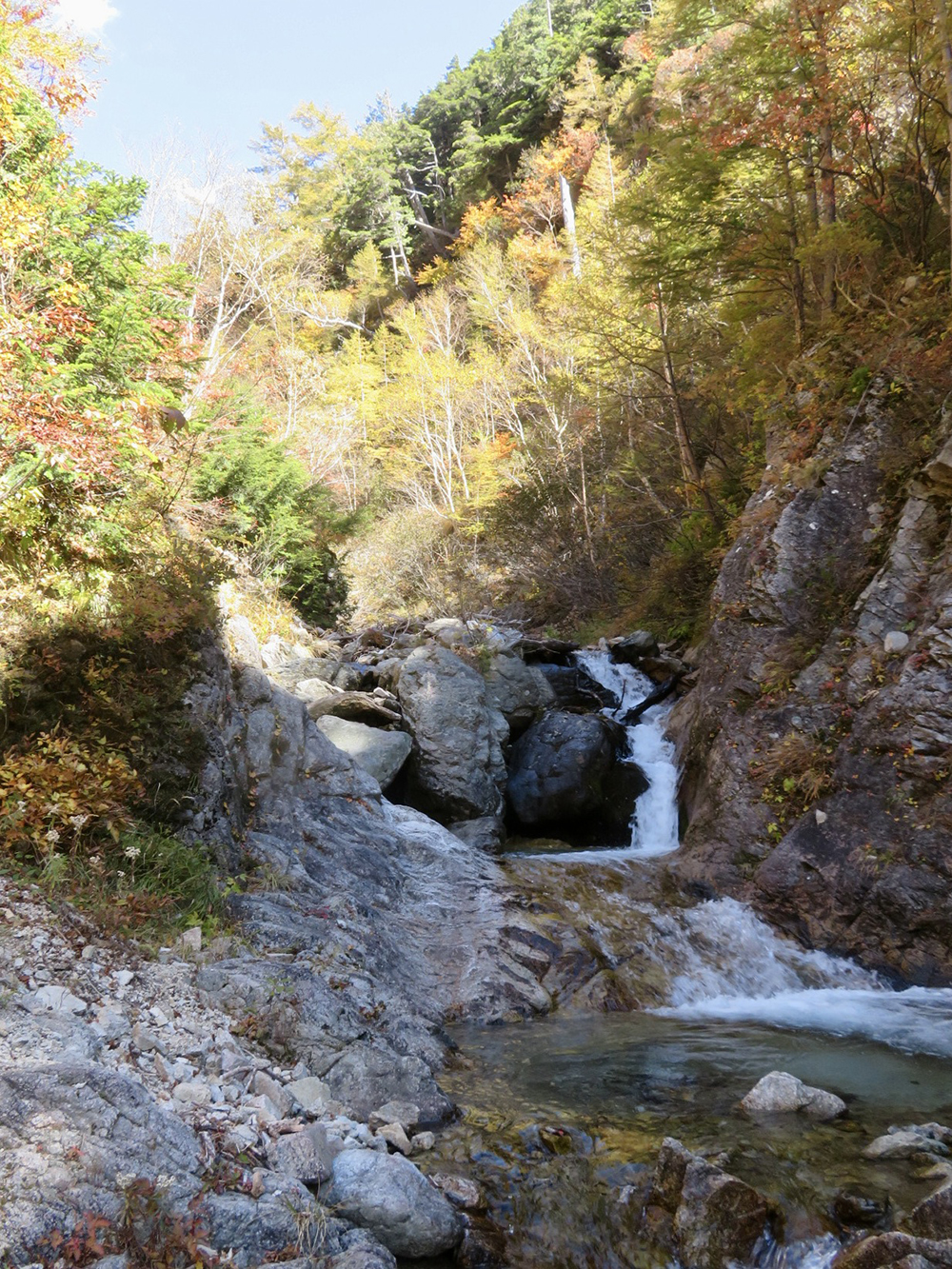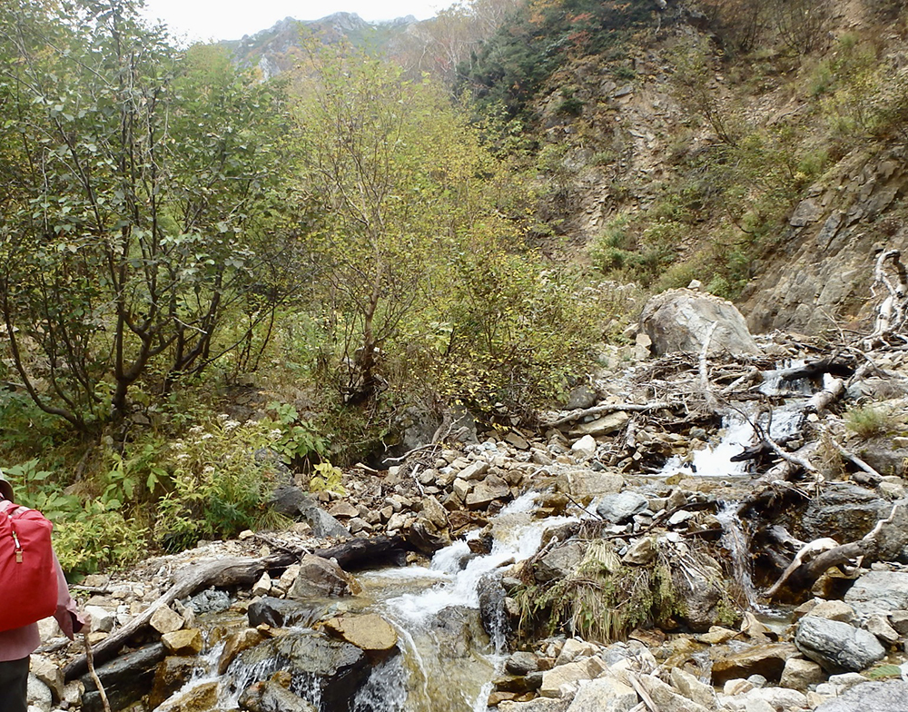 次第に水量が減ってくるので、道跡を探すより徒渉した方が早くて確実な場合もあり、水量など沢の状況により現地で判断するのが良いでしょう。