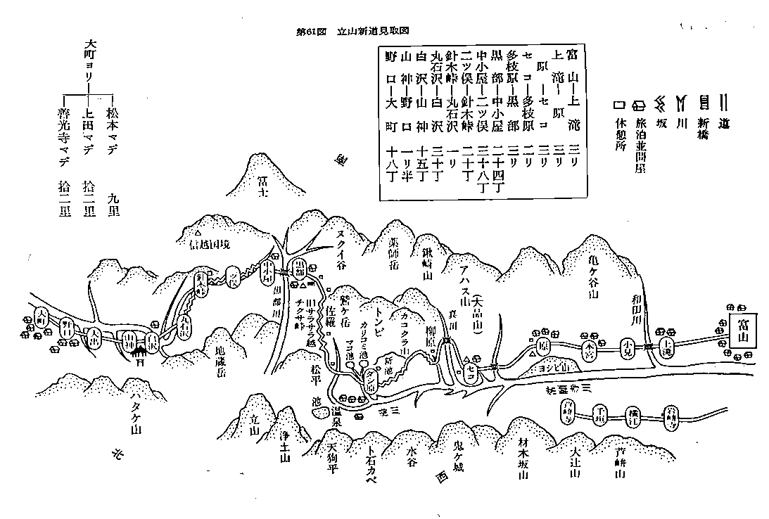 明治初期には、富山と長野を結ぶ、我が国初の山岳有料道路として整備されましたが、厳しい自然条件のため、開業して間もなく廃道となりました。