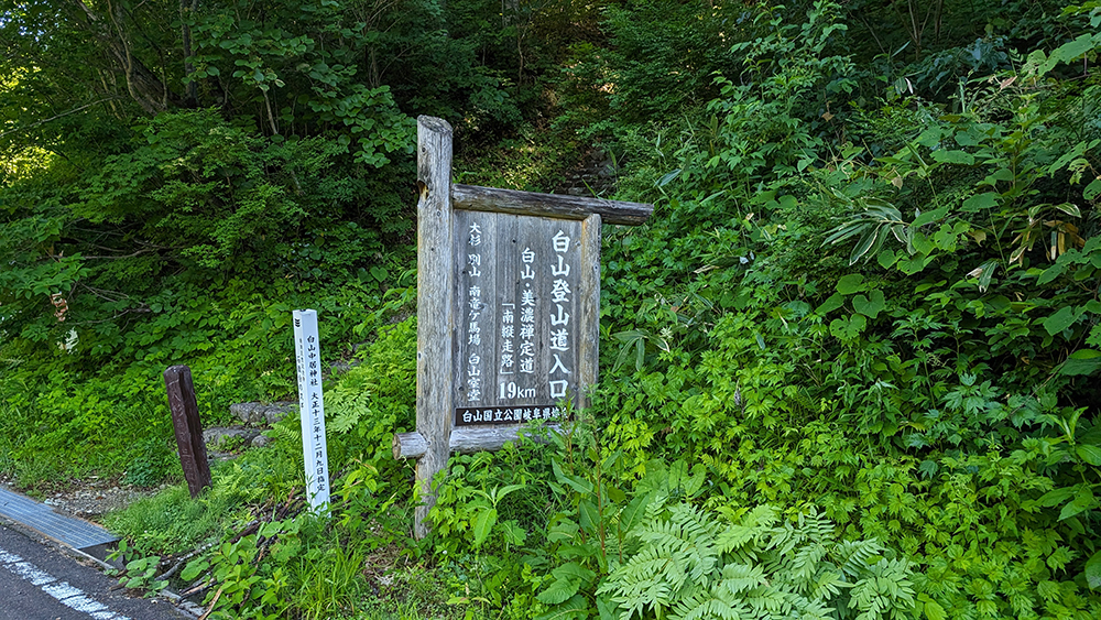 美濃禅定道へは、白山中居神社からの林道を6kmほど経て石徹白登山口から始まります。