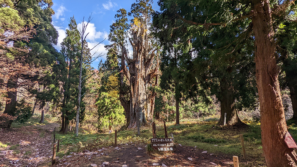 登山口から20分ほど石段を登ると、国の特別天然記念物「いとしろ大杉」に到着します。