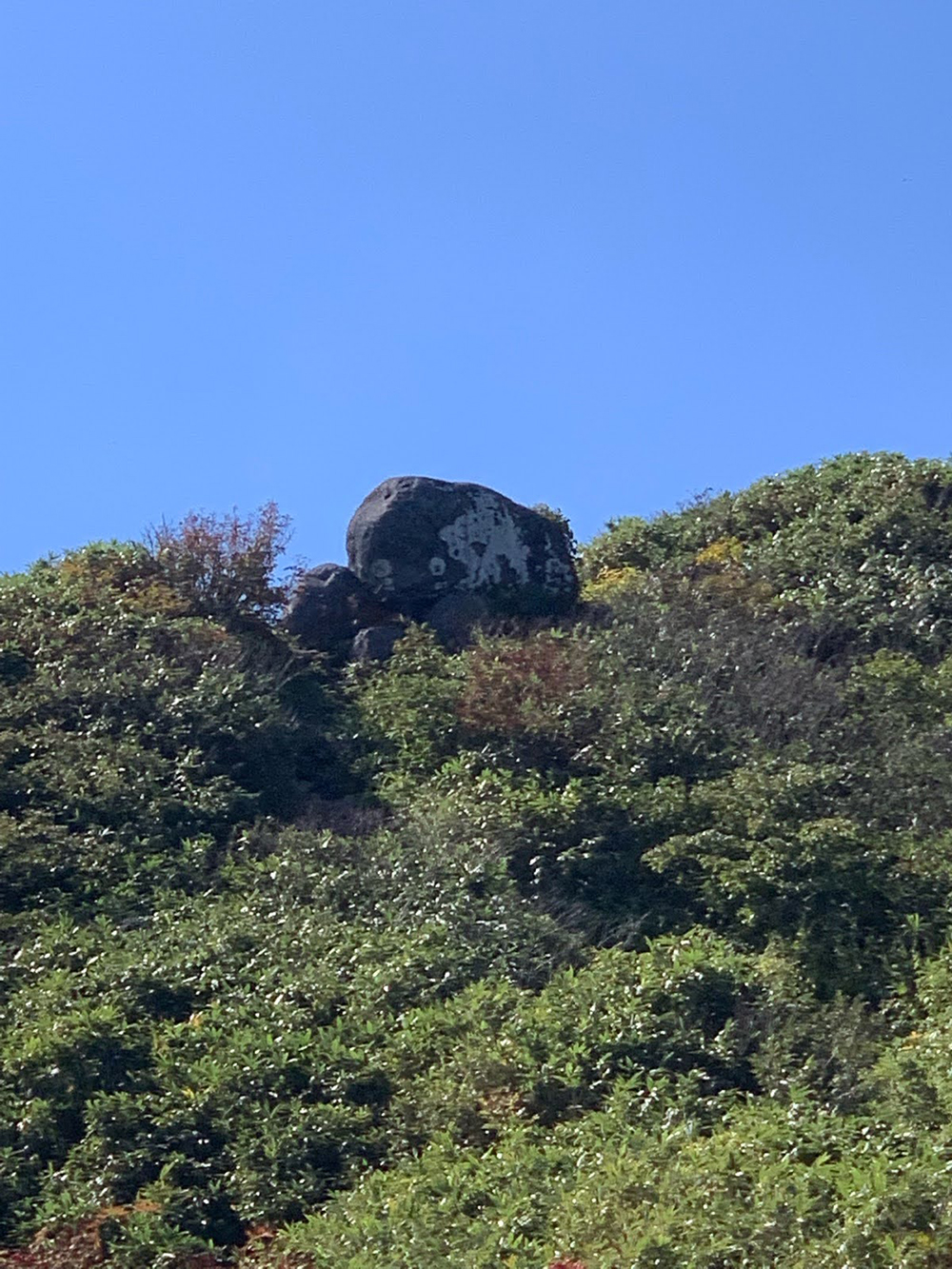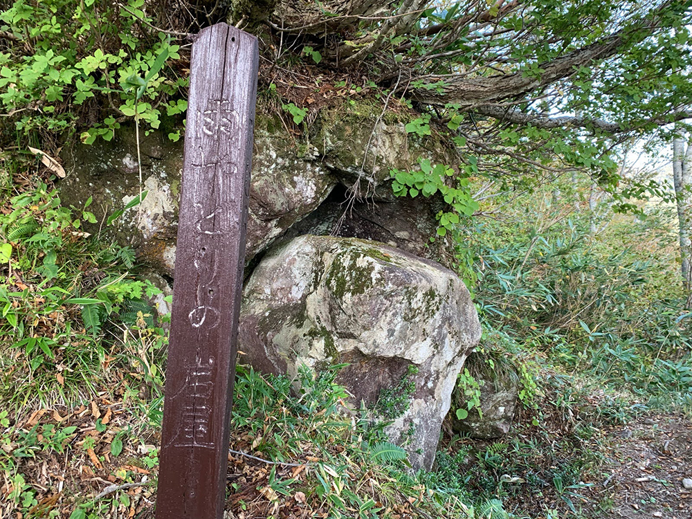 気持ちのよいブナの林をしばらく進むと笹原の道になり、特徴的な母御石が目に入ってきます。