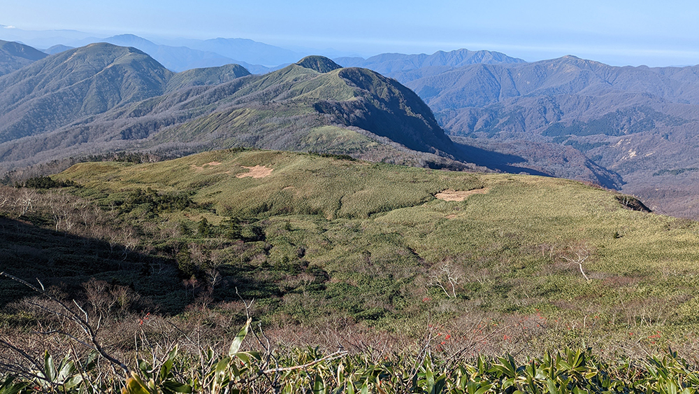 銚子ヶ峰からは、左手に野伏ヶ岳から願教寺山に連なる山々が原始の自然を残した美しい風景が広がります。