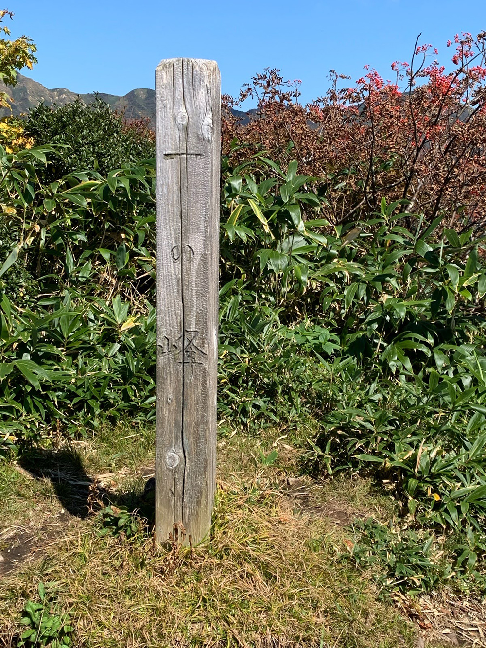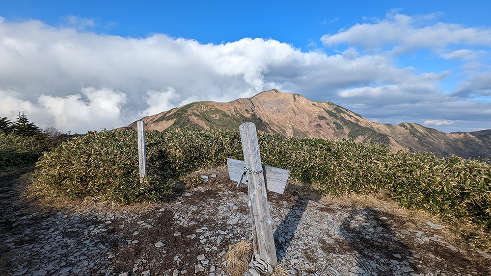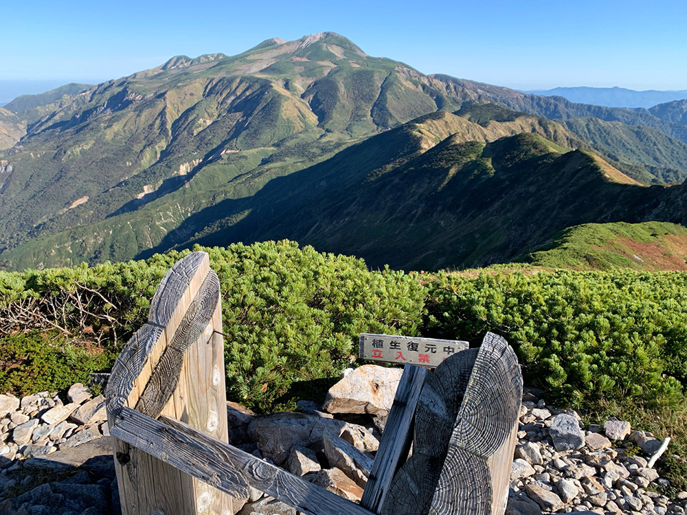 三ノ峰山頂(2128m)は福井県境からわずかに外れているため、福井県の最高峰ではありません。福井県の最高峰は同じ両白山地の経ヶ岳(1625m)です。しかし、山頂ではありませんが、福井県の最高地点は三ノ峰避難小屋の裏の笹原にある2095m地点です。ここには標識があるので、時間があれば探してみてください。