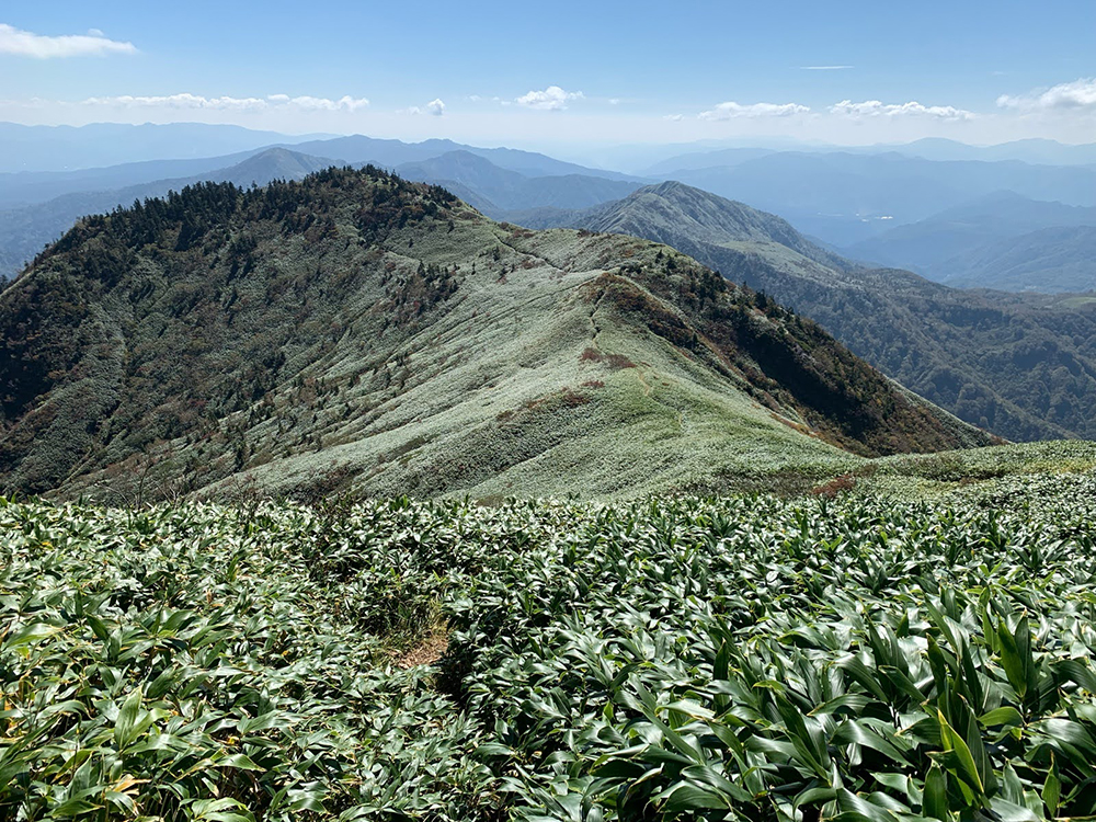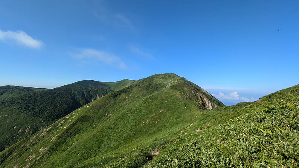 緑の笹の中を北上する尾根道に沿って続く、左右に遮るものがない美しい稜線は、すべての人を魅了するでしょう。。
