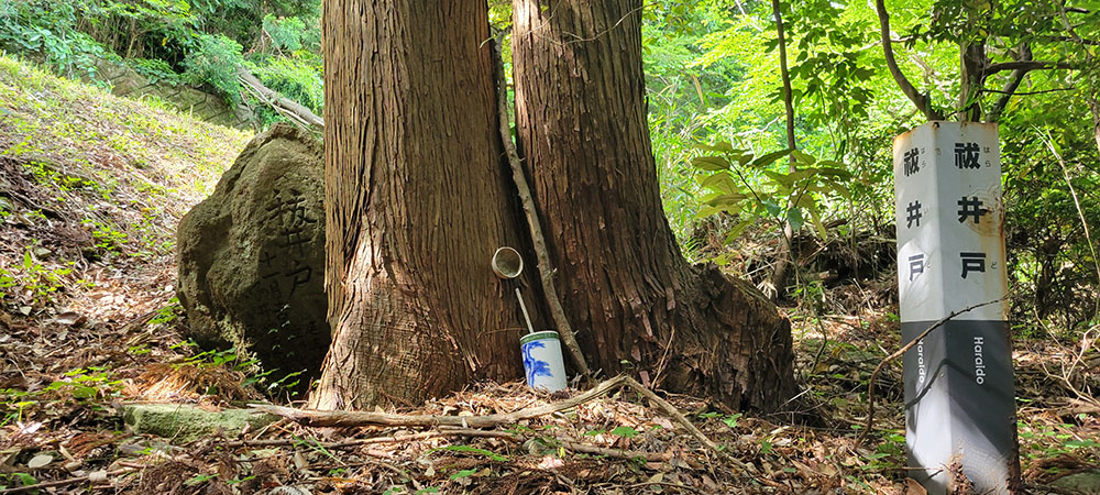 舗装道路のコーナーを過ぎたあたりに標識があり、右へ下って行く山道に入るとすぐの木の根元に「祓井戸」があります。