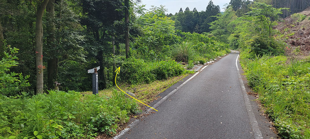 1kmほど進み、地図上、原井戸という地名辺りで、少しだけ舗装道路になりますが、そのまま進むとすぐに標識があり、左へ向かって山道へ入ります。