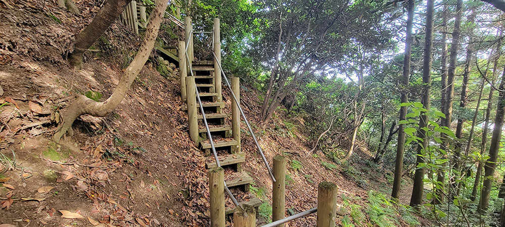 さらに900mくらい進むと国道9号線の手前辺りで木段となり、それを下ると、国道9号線に出ます。