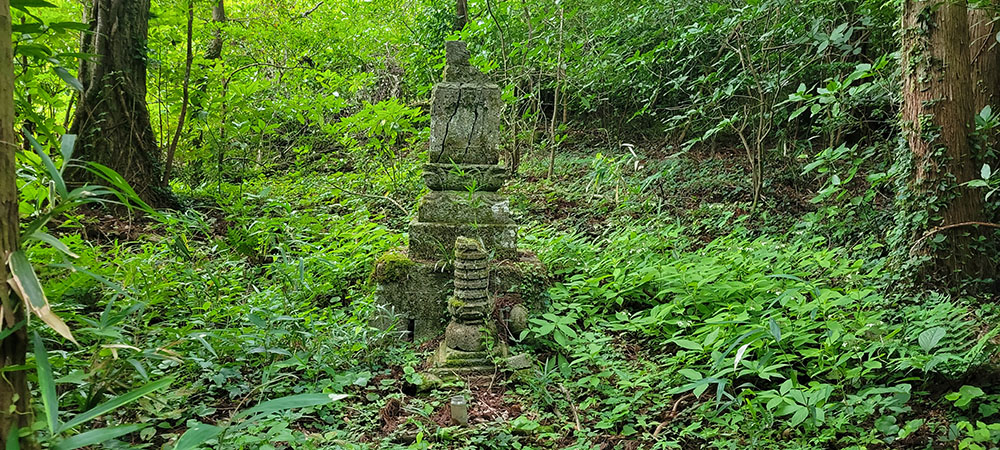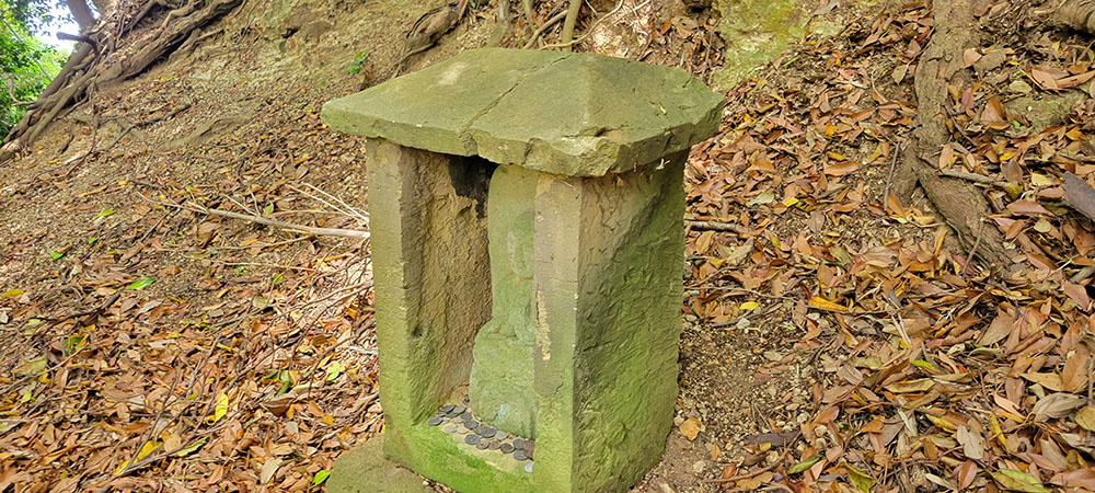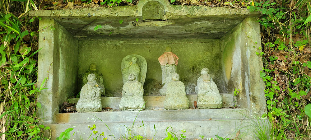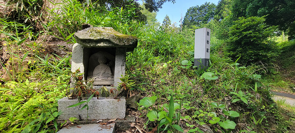 山道に入ってから約1km進むと舗装道路に出ますが、それを横切り、民家の横を50mほど進むと再び舗装道路へ行き当たります。その角に「胴地蔵」があります。